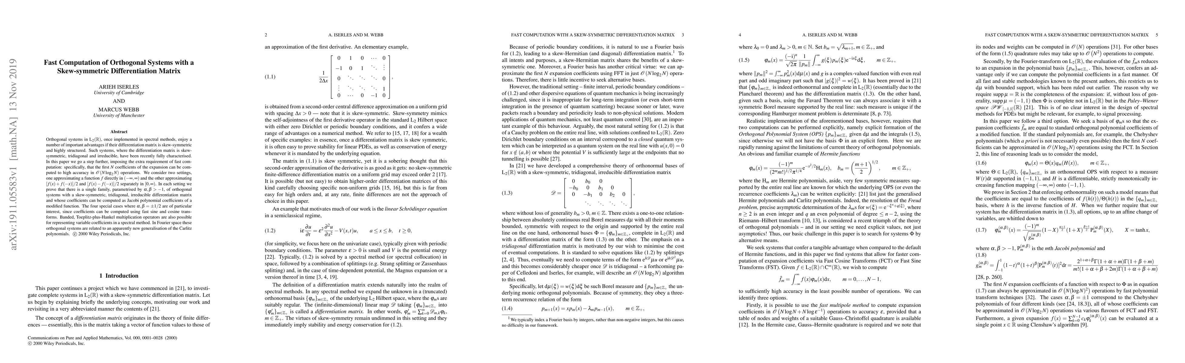 Orthogonal systems in $\mathrm{L}_2(\mathbb{R})$, once implemented in spectral methods, enjoy a number of important advantages if their differentiation matrix is skew-symmetric and highly structured. Such systems, where the differentiation matrix is skew-symmetric, tridiagonal and irreducible, have been recently fully characterised. In this paper we go a step further, imposing the extra requirement of fast computation: specifically, that the first $N$ coefficients {of the expansion} can be computed to high accuracy in $\mathcal{O}(N\log_2N)$ operations. We consider two settings, one approximating a function $f$ directly in $(-\infty,\infty)$ and the other approximating $[f(x)+f(-x)]/2$ and $[f(x)-f(-x)]/2$ separately in $[0,\infty)$. In each setting we prove that there is a single family, parametrised by $\alpha,\beta > -1$, of orthogonal systems with a skew-symmetric, tridiagonal, irreducible differentiation matrix and whose coefficients can be computed as Jacobi polynomial coefficients of a modified function. The four special cases where $\alpha, \beta= \pm 1/2$ are of particular interest, since coefficients can be computed using fast sine and cosine transforms. Banded, Toeplitz-plus-Hankel multiplication operators are also possible for representing variable coefficients in a spectral method. In Fourier space these orthogonal systems are related to an apparently new generalisation of the Carlitz polynomials.
