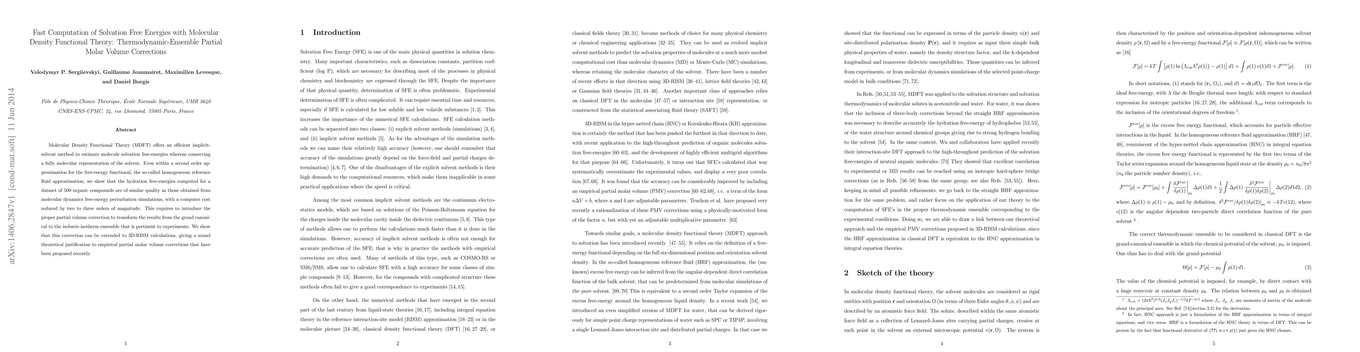 This paper presents a fast computation method using Molecular Density Functional Theory (MDFT) to estimate solvation free energies, achieving similar accuracy to molecular dynamics simulations but with significantly lower computational cost. The method incorporates thermodynamic-ensemble partial molar volume corrections to align theoretical results with experimental conditions.