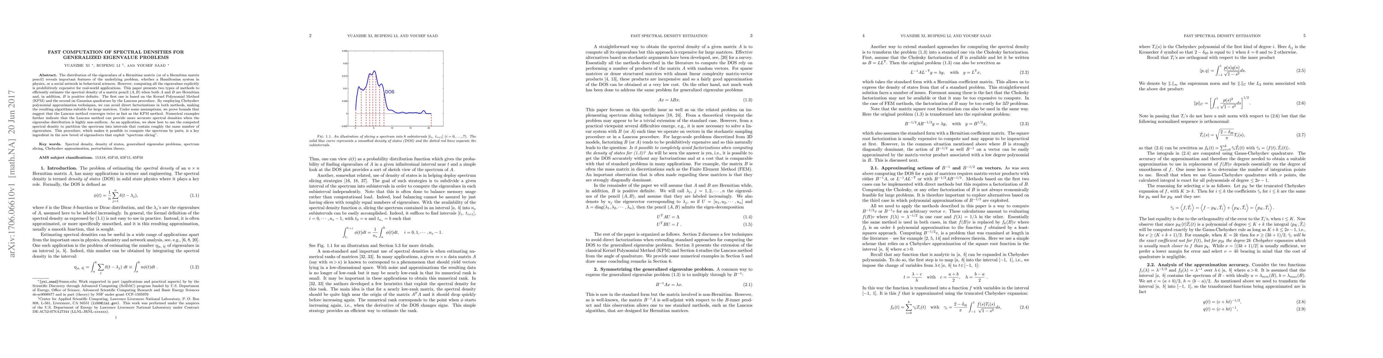 The distribution of the eigenvalues of a Hermitian matrix (or of a Hermitian matrix pencil) reveals important features of the underlying problem, whether a Hamiltonian system in physics, or a social network in behavioral sciences. However, computing all the eigenvalues explicitly is prohibitively expensive for real-world applications. This paper presents two types of methods to efficiently estimate the spectral density of a matrix pencil $(A, B)$ when both $A$ and $B$ are Hermitian and, in addition, $B$ is positive definite. The first one is based on the Kernel Polynomial Method (KPM) and the second on Gaussian quadrature by the Lanczos procedure. By employing Chebyshev polynomial approximation techniques, we can avoid direct factorizations in both methods, making the resulting algorithms suitable for large matrices. Under some assumptions, we prove bounds that suggest that the Lanczos method converges twice as fast as the KPM method. Numerical examples further indicate that the Lanczos method can provide more accurate spectral densities when the eigenvalue distribution is highly non-uniform. As an application, we show how to use the computed spectral density to partition the spectrum into intervals that contain roughly the same number of eigenvalues. This procedure, which makes it possible to compute the spectrum by parts, is a key ingredient in the new breed of eigensolvers that exploit "spectrum slicing".