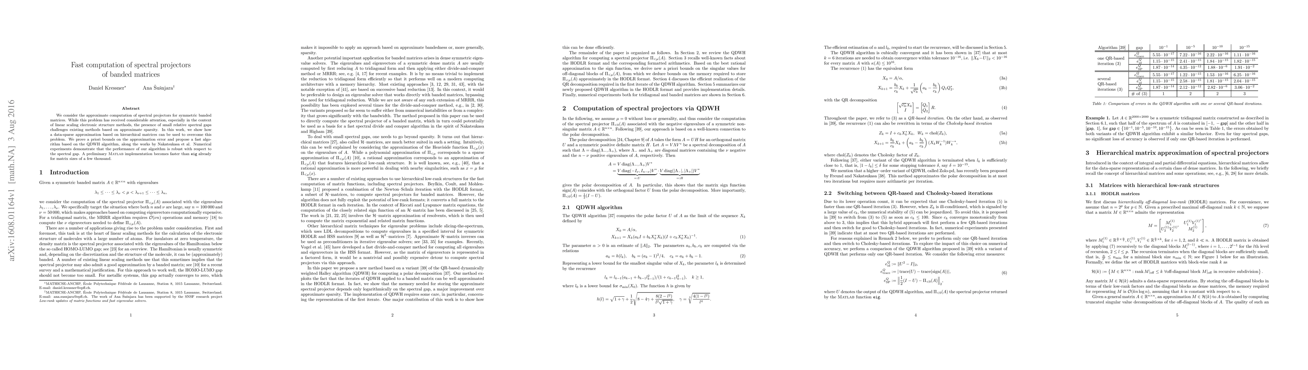 This paper proposes a fast algorithm for computing spectral projectors of symmetric banded matrices using hierarchical matrices to overcome challenges posed by small spectral gaps. The method is shown to be robust and outperforms existing methods, as demonstrated by a preliminary Matlab implementation.