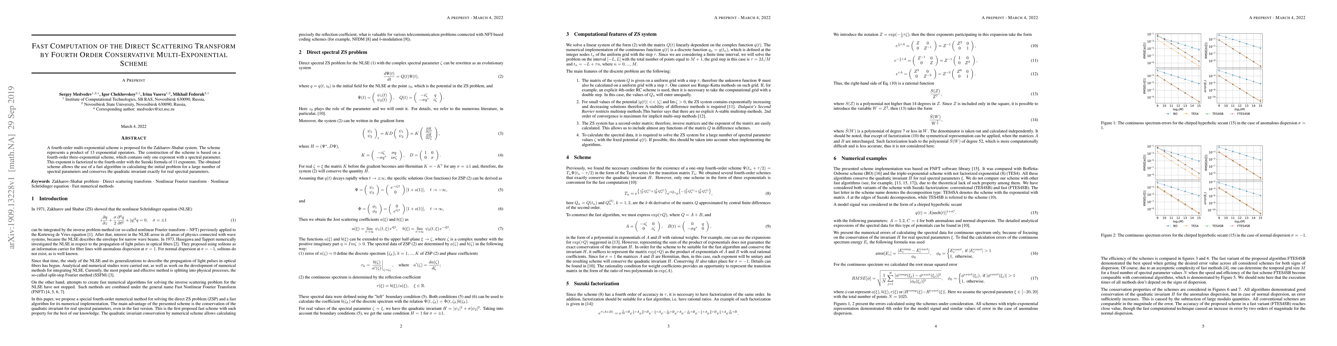 A new method for solving the Zakharov-Shabat system is proposed using a fourth-order multi-exponential scheme that allows for fast computation of the direct scattering transform, conserving quadratic invariants exactly.