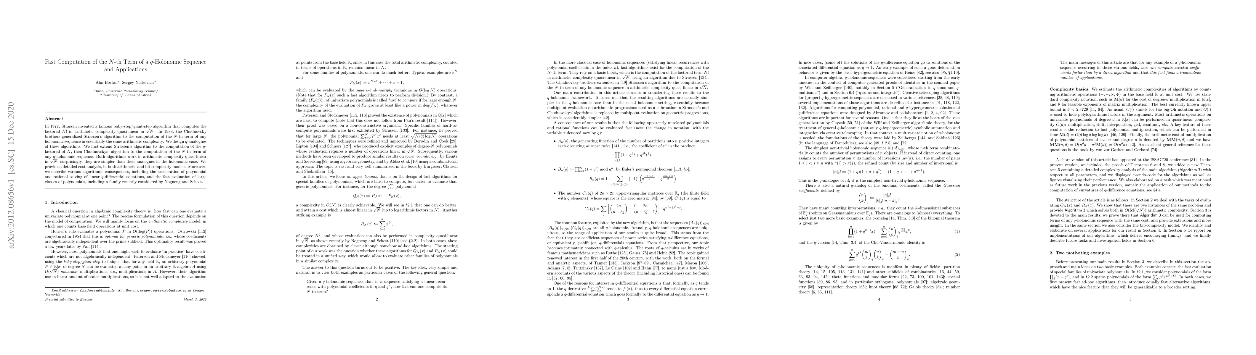 This paper presents $q$-analogues of Strassen's and the Chudnovsky brothers' algorithms for computing the $N$-th term of holonomic sequences, achieving quasi-linear arithmetic complexity in $\sqrt{N}$. The $q$-analogues simplify the computation of $q$-factorials and $q$-holonomic sequences, with applications to solving $q$-differential equations and evaluating large classes of polynomials.