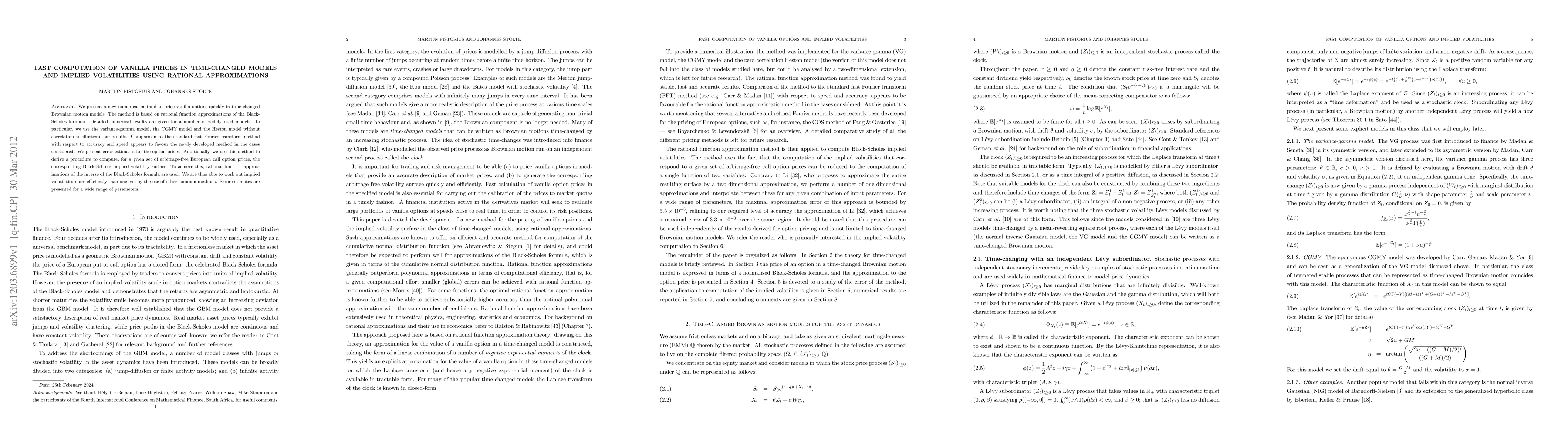 We present a new numerical method to price vanilla options quickly in time-changed Brownian motion models. The method is based on rational function approximations of the Black-Scholes formula. Detailed numerical results are given for a number of widely used models. In particular, we use the variance-gamma model, the CGMY model and the Heston model without correlation to illustrate our results. Comparison to the standard fast Fourier transform method with respect to accuracy and speed appears to favour the newly developed method in the cases considered. We present error estimates for the option prices. Additionally, we use this method to derive a procedure to compute, for a given set of arbitrage-free European call option prices, the corresponding Black-Scholes implied volatility surface. To achieve this, rational function approximations of the inverse of the Black-Scholes formula are used. We are thus able to work out implied volatilities more efficiently than one can by the use of other common methods. Error estimates are presented for a wide range of parameters.