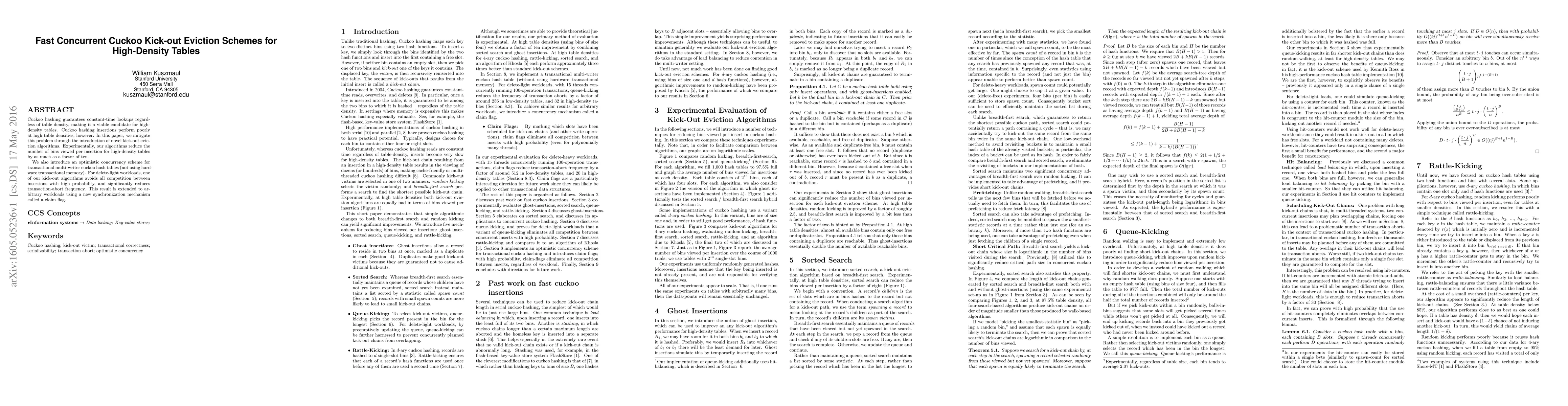 This paper proposes fast concurrent kick-out eviction algorithms to improve the performance of cuckoo hashing at high table densities, reducing insertion time by up to ten times. It also introduces an optimistic concurrency scheme for multi-writer transactional cuckoo hash tables, significantly lowering transaction-abort frequency and competition for insertions.