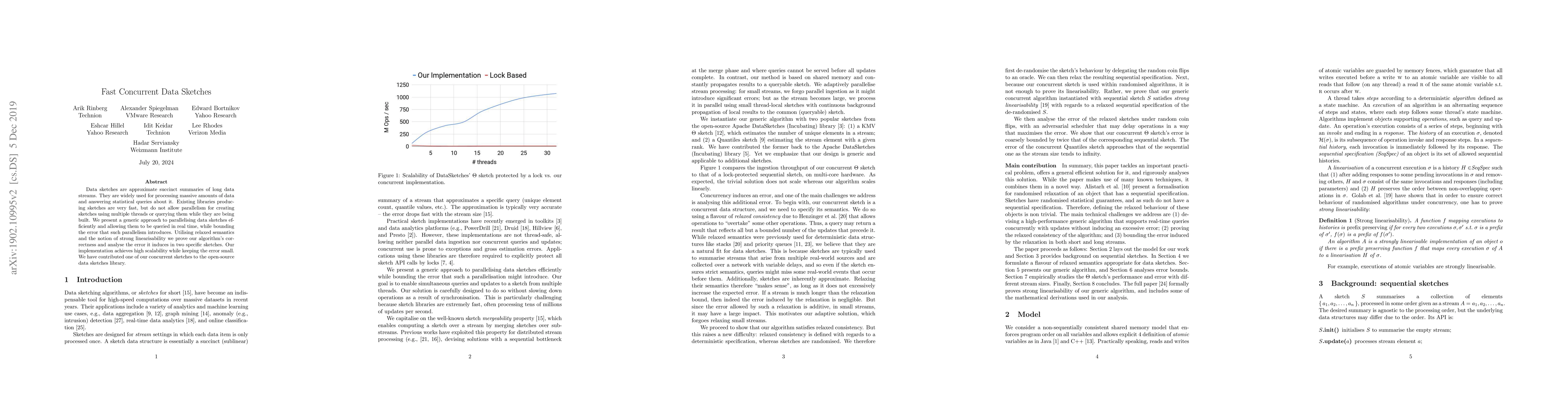 Data sketches are approximate succinct summaries of long streams. They are widely used for processing massive amounts of data and answering statistical queries about it in real-time. Existing libraries producing sketches are very fast, but do not allow parallelism for creating sketches using multiple threads or querying them while they are being built. We present a generic approach to parallelising data sketches efficiently, while bounding the error that such parallelism introduces. Utilising relaxed semantics and the notion of strong linearisability we prove our algorithm's correctness and analyse the error it induces in two specific sketches. Our implementation achieves high scalability while keeping the error small.