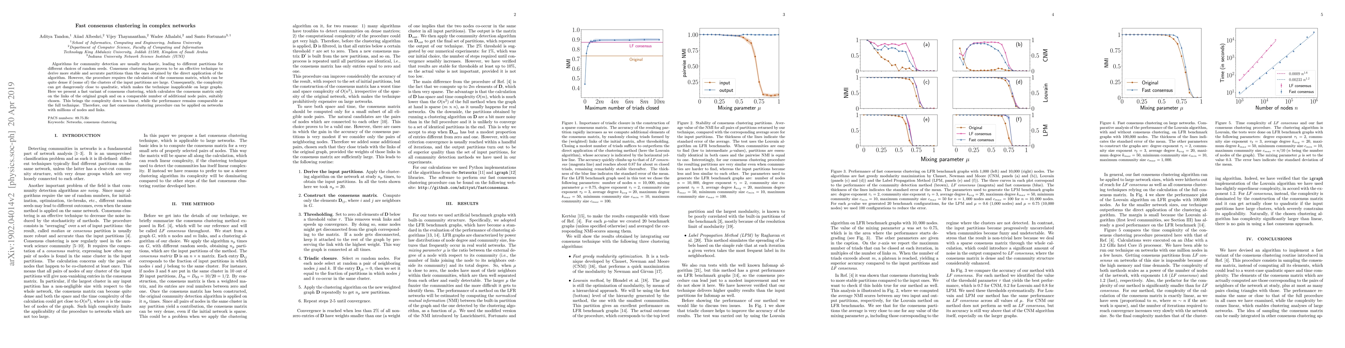This paper presents a fast consensus clustering algorithm that reduces computational complexity from quadratic to linear by selectively calculating the consensus matrix, enabling its application to large networks with millions of nodes. The method maintains comparable performance to traditional consensus clustering.