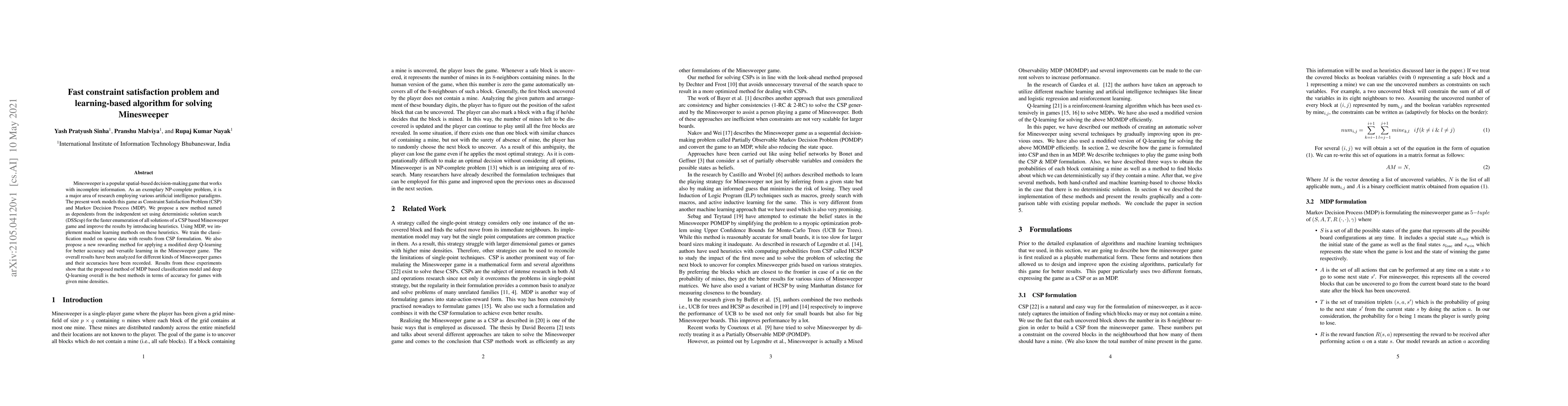 Minesweeper is a popular spatial-based decision-making game that works with incomplete information. As an exemplary NP-complete problem, it is a major area of research employing various artificial intelligence paradigms. The present work models this game as Constraint Satisfaction Problem (CSP) and Markov Decision Process (MDP). We propose a new method named as dependents from the independent set using deterministic solution search (DSScsp) for the faster enumeration of all solutions of a CSP based Minesweeper game and improve the results by introducing heuristics. Using MDP, we implement machine learning methods on these heuristics. We train the classification model on sparse data with results from CSP formulation. We also propose a new rewarding method for applying a modified deep Q-learning for better accuracy and versatile learning in the Minesweeper game. The overall results have been analyzed for different kinds of Minesweeper games and their accuracies have been recorded. Results from these experiments show that the proposed method of MDP based classification model and deep Q-learning overall is the best methods in terms of accuracy for games with given mine densities.