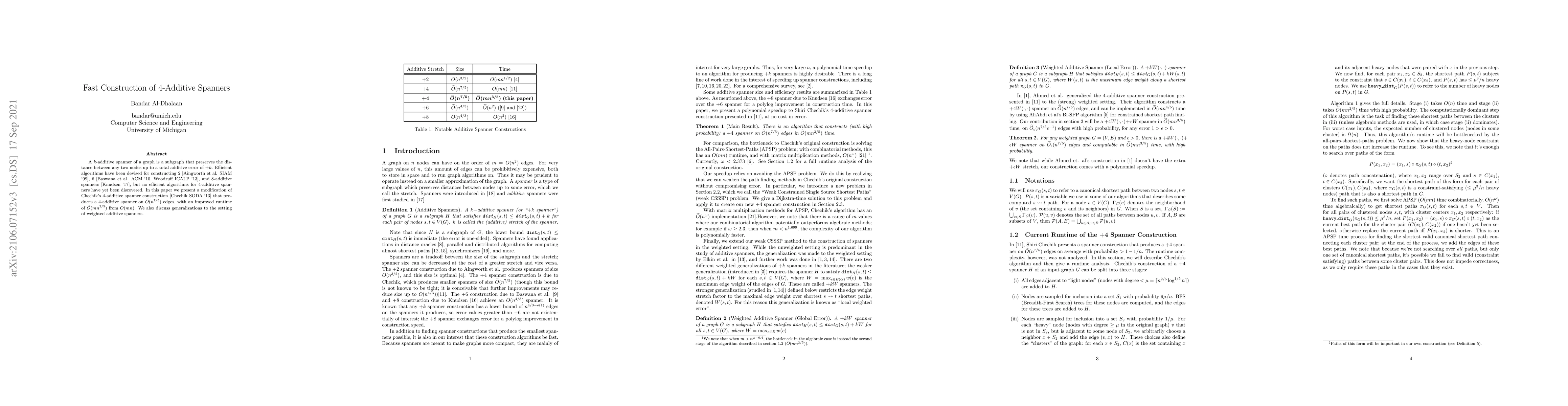 This paper presents an efficient algorithm for constructing 4-additive spanners in graphs, improving both the edge count and runtime compared to previous methods. The new approach achieves a spanner with $\Oish(n^{7/5})$ edges in $\Oish(mn^{3/5})$ time.