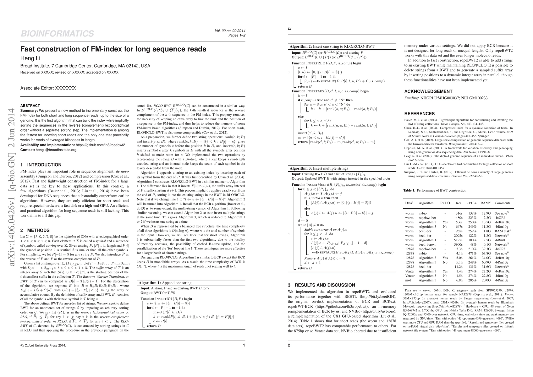 Summary: This paper introduces a novel algorithm for incrementally constructing the FM-index for sequence reads, achieving the first implicit sorting of sequences in reverse lexicographical order without separate sorting, and is the fastest for short reads and practical for kilobase-length reads. Implementation available at https://github.com/lh3/ropebwt2.