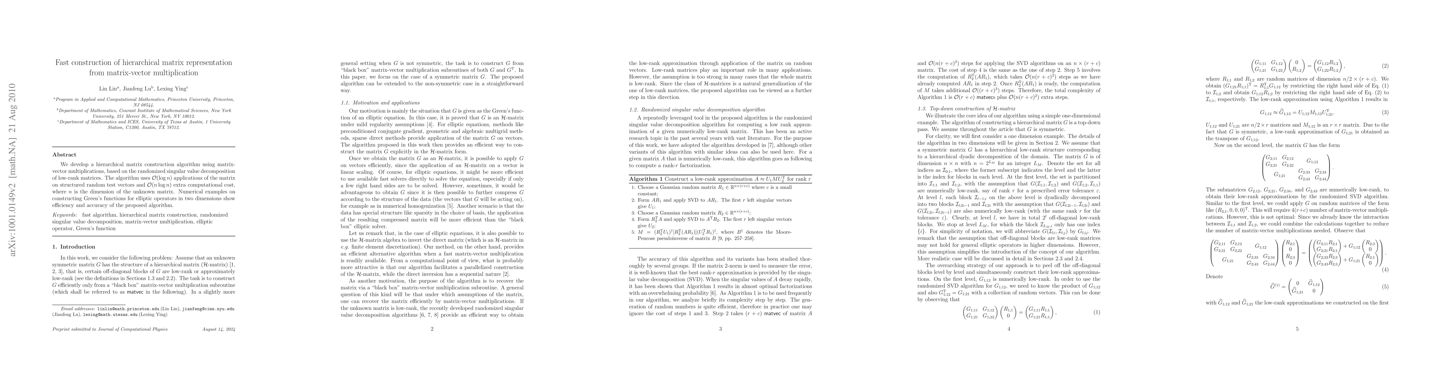 This paper presents an efficient algorithm for constructing hierarchical matrix representations using matrix-vector multiplications and randomized singular value decomposition. The method requires $\mathcal{O}(\log n)$ applications and $\mathcal{O}(n \log n)$ extra computation, demonstrating efficiency and accuracy in constructing Green's functions for elliptic operators.