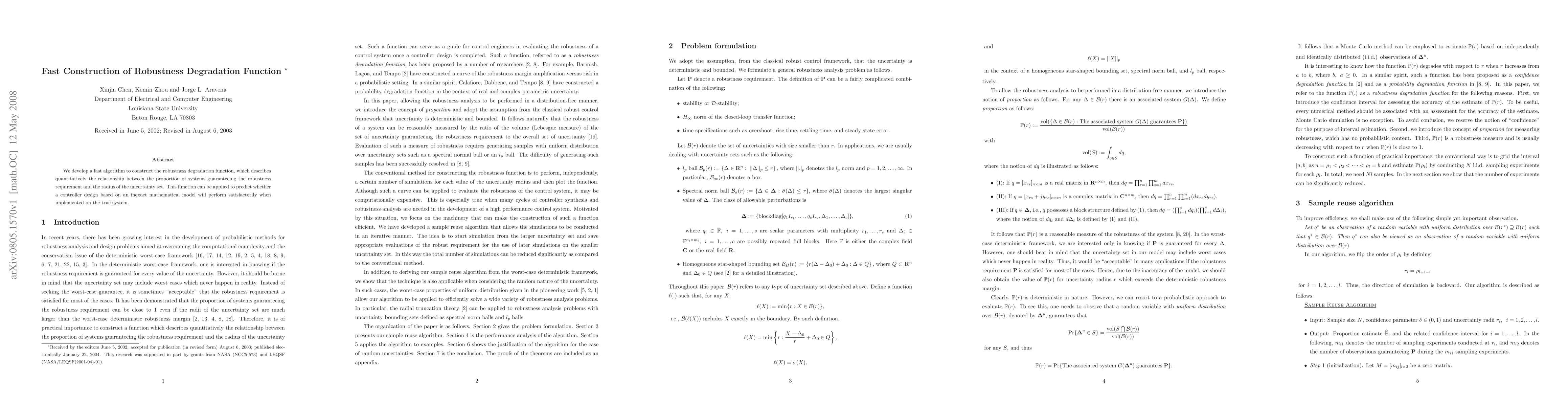 We develop a fast algorithm to construct the robustness degradation function, which describes quantitatively the relationship between the proportion of systems guaranteeing the robustness requirement and the radius of the uncertainty set. This function can be applied to predict whether a controller design based on an inexact mathematical model will perform satisfactorily when implemented on the true system.