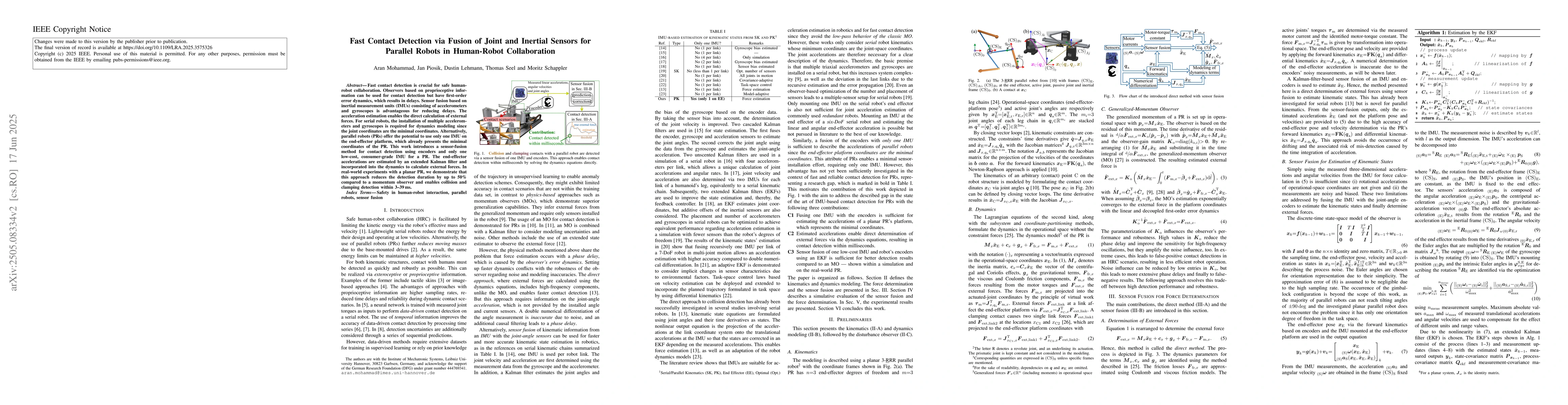The research proposes a sensor-fusion method for contact detection in parallel robots (PRs) using encoders and a single low-cost IMU, estimating end-effector accelerations via an extended Kalman filter for external force calculation.