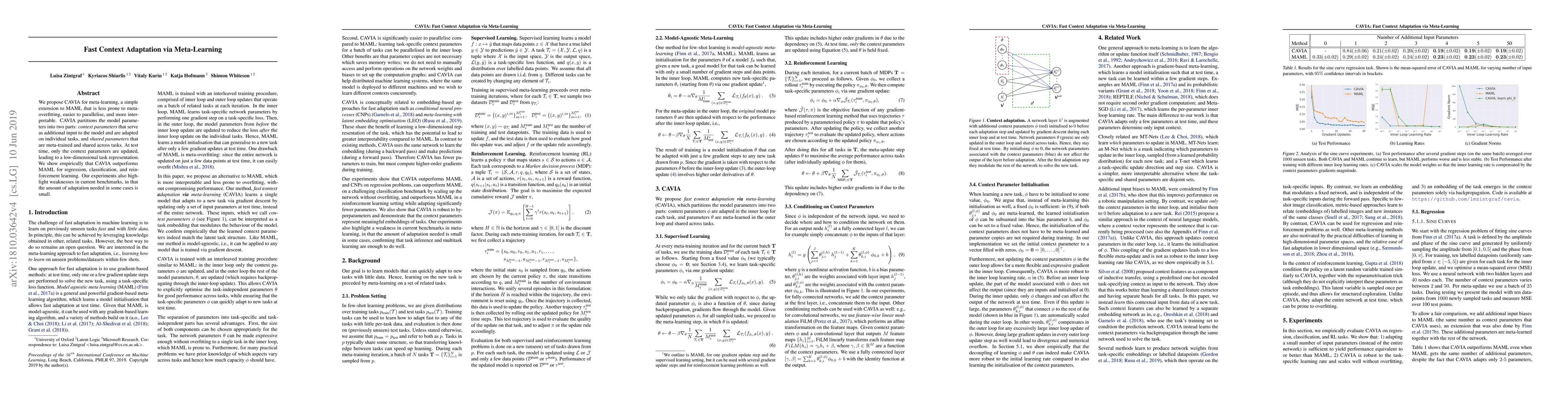 Title: Fast Context Adaptation via Meta-Learning Summary: CAVIA extends MAML to reduce meta-overfitting and enhance interpretability through parameter partitioning; it outperforms MAML across regression, classification, and reinforcement learning, while highlighting shortcomings in existing benchmarks.