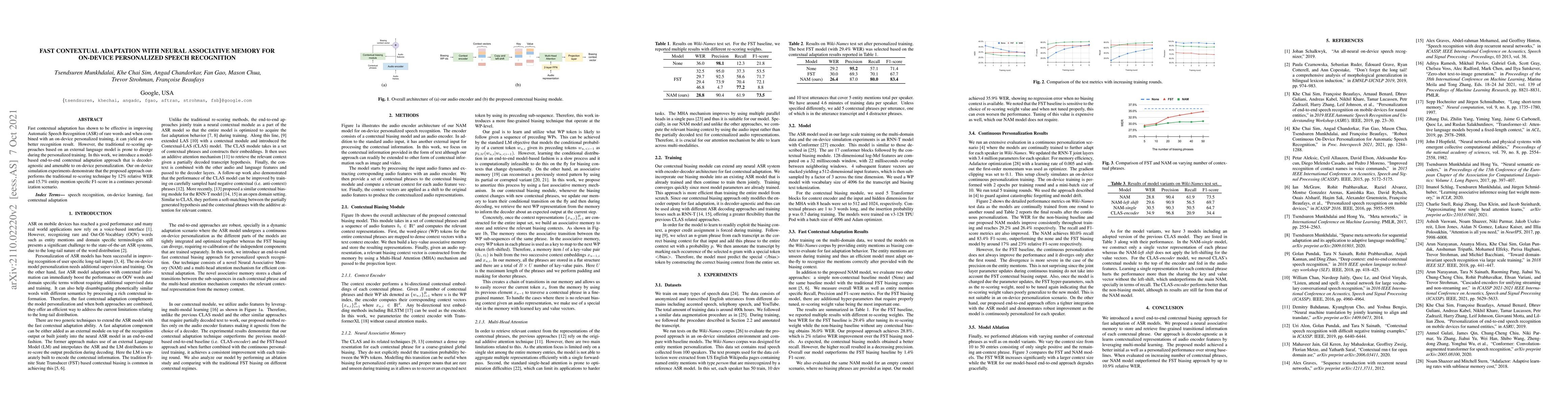 This paper introduces a novel neural associative memory model for fast contextual adaptation in on-device personalized speech recognition, achieving better results than traditional re-scoring methods. Experimental results show a 12% relative Word Error Rate (WER) improvement and a 15.7% increase in entity mention specific F1-score.