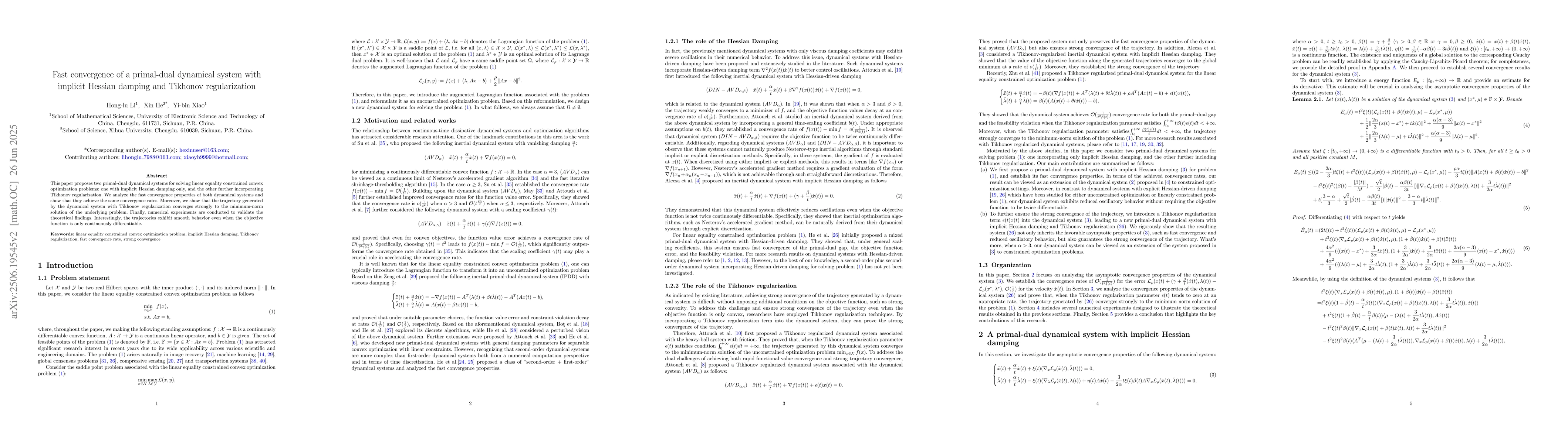 This paper proposes two primal-dual dynamical systems for solving linear equality constrained convex optimization problems: one with implicit Hessian damping only, and the other further incorporating Tikhonov regularization. We analyze the fast convergence properties of both dynamical systems and show that they achieve the same convergence rates. Moreover, we show that the trajectory generated by the dynamical system with Tikhonov regularization converges strongly to the minimum-norm solution of the underlying problem. Finally, numerical experiments are conducted to validate the theoretical findings. Interestingly, the trajectories exhibit smooth behavior even when the objective function is only continuously differentiable.