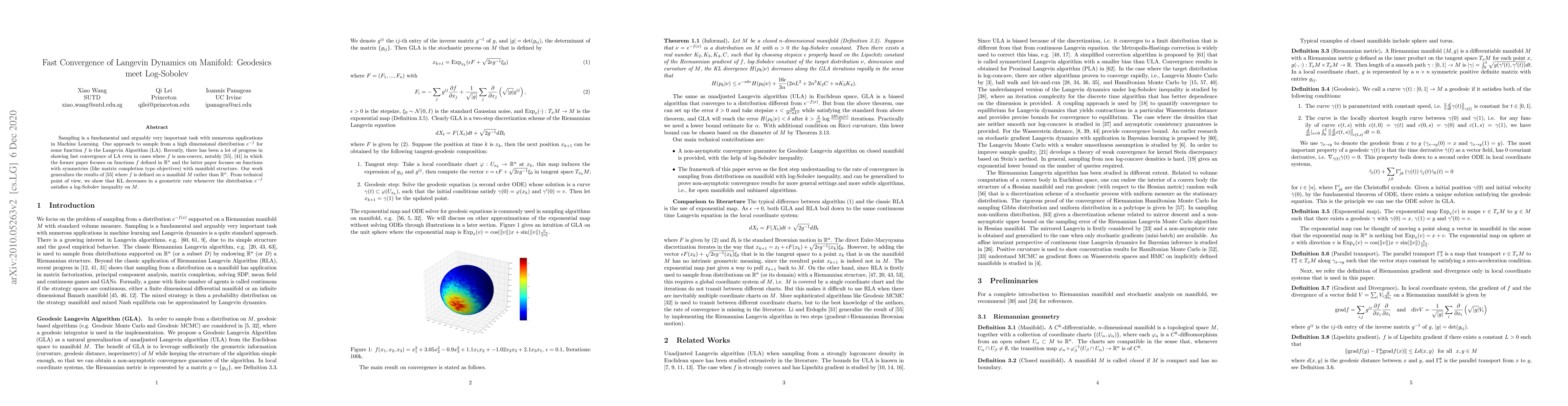 Sampling is a fundamental and arguably very important task with numerous applications in Machine Learning. One approach to sample from a high dimensional distribution $e^{-f}$ for some function $f$ is the Langevin Algorithm (LA). Recently, there has been a lot of progress in showing fast convergence of LA even in cases where $f$ is non-convex, notably [53], [39] in which the former paper focuses on functions $f$ defined in $\mathbb{R}^n$ and the latter paper focuses on functions with symmetries (like matrix completion type objectives) with manifold structure. Our work generalizes the results of [53] where $f$ is defined on a manifold $M$ rather than $\mathbb{R}^n$. From technical point of view, we show that KL decreases in a geometric rate whenever the distribution $e^{-f}$ satisfies a log-Sobolev inequality on $M$.
