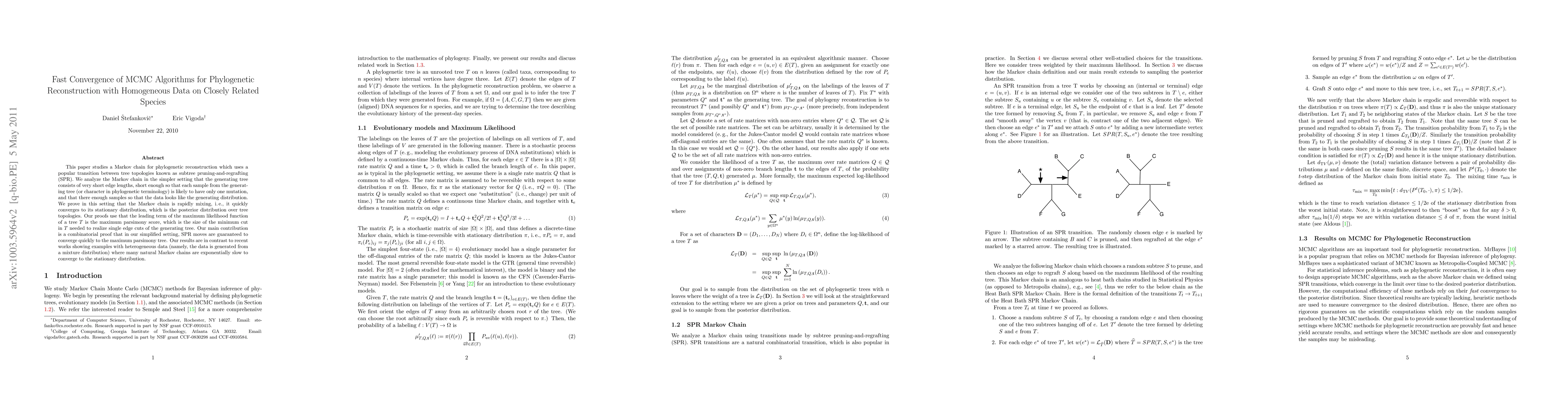 This paper studies a Markov chain for phylogenetic reconstruction which uses a popular transition between tree topologies known as subtree pruning-and-regrafting (SPR). We analyze the Markov chain in the simpler setting that the generating tree consists of very short edge lengths, short enough so that each sample from the generating tree (or character in phylogenetic terminology) is likely to have only one mutation, and that there enough samples so that the data looks like the generating distribution. We prove in this setting that the Markov chain is rapidly mixing, i.e., it quickly converges to its stationary distribution, which is the posterior distribution over tree topologies. Our proofs use that the leading term of the maximum likelihood function of a tree T is the maximum parsimony score, which is the size of the minimum cut in T needed to realize single edge cuts of the generating tree. Our main contribution is a combinatorial proof that in our simplified setting, SPR moves are guaranteed to converge quickly to the maximum parsimony tree. Our results are in contrast to recent works showing examples with heterogeneous data (namely, the data is generated from a mixture distribution) where many natural Markov chains are exponentially slow to converge to the stationary distribution.