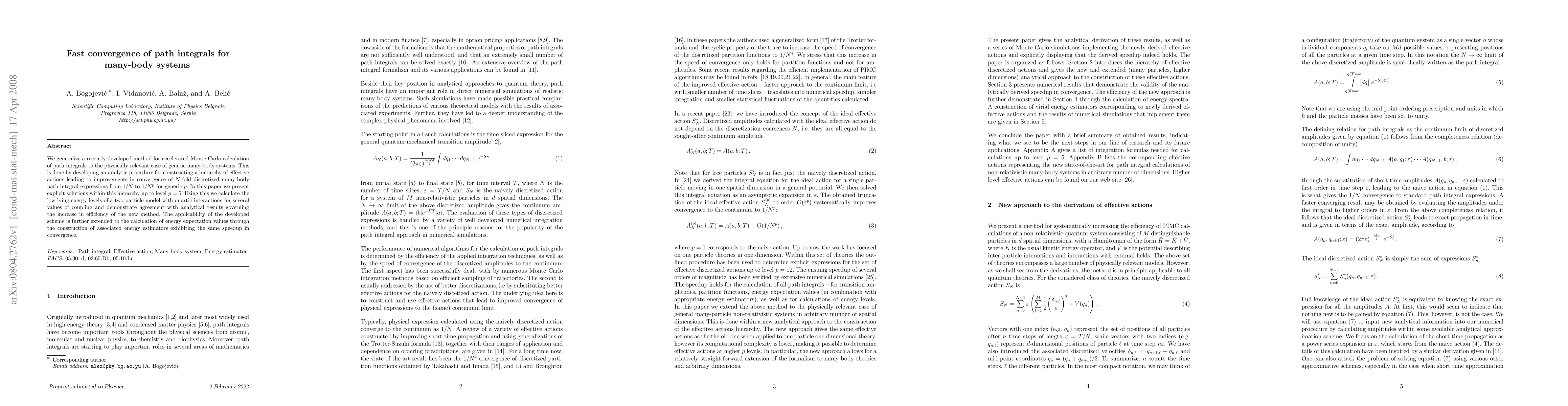 We generalize a recently developed method for accelerated Monte Carlo calculation of path integrals to the physically relevant case of generic many-body systems. This is done by developing an analytic procedure for constructing a hierarchy of effective actions leading to improvements in convergence of $N$-fold discretized many-body path integral expressions from 1/N to $1/N^p$ for generic $p$. In this paper we present explicit solutions within this hierarchy up to level $p=5$. Using this we calculate the low lying energy levels of a two particle model with quartic interactions for several values of coupling and demonstrate agreement with analytical results governing the increase in efficiency of the new method. The applicability of the developed scheme is further extended to the calculation of energy expectation values through the construction of associated energy estimators exhibiting the same speedup in convergence.