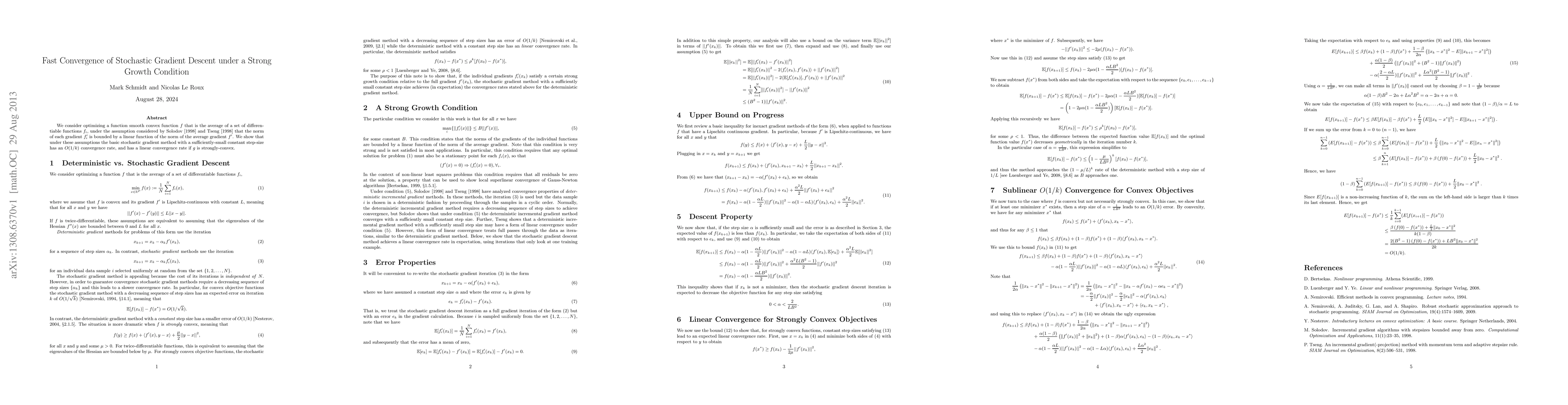We consider optimizing a function smooth convex function $f$ that is the average of a set of differentiable functions $f_i$, under the assumption considered by Solodov [1998] and Tseng [1998] that the norm of each gradient $f_i'$ is bounded by a linear function of the norm of the average gradient $f'$. We show that under these assumptions the basic stochastic gradient method with a sufficiently-small constant step-size has an $O(1/k)$ convergence rate, and has a linear convergence rate if $g$ is strongly-convex.