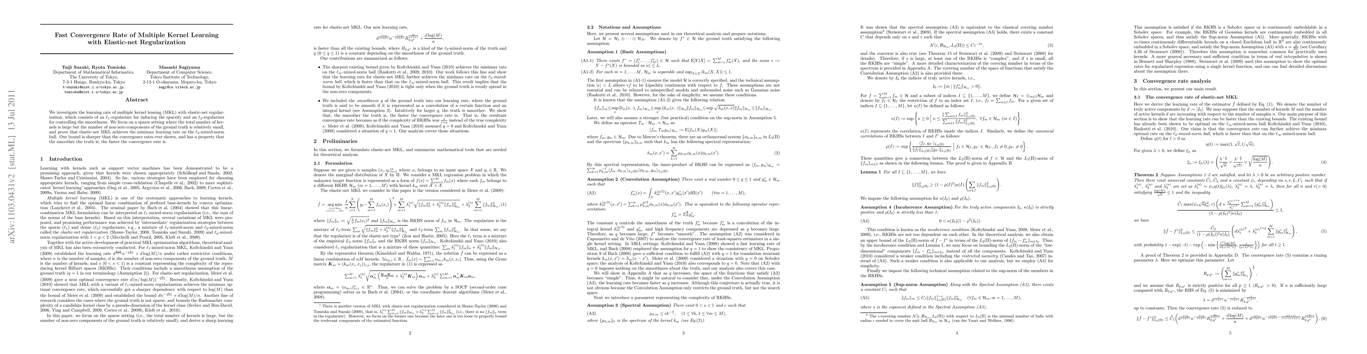 This paper investigates the convergence rate of multiple kernel learning with elastic-net regularization, proving that it achieves the minimax learning rate in sparse settings. The proposed method combines $\ell_1$ and $\ell_2$ regularization, leading to faster convergence when the ground truth is smoother.