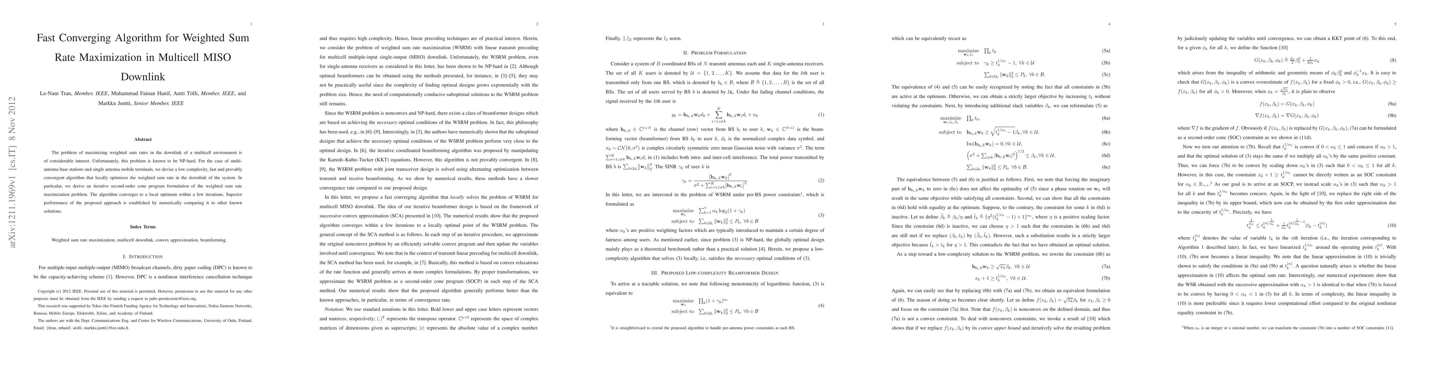 This paper proposes a low-complexity, fast converging algorithm for maximizing weighted sum rates in multicell MISO downlink systems, leveraging an iterative second-order cone program. The algorithm achieves local optimality within a few iterations, outperforming other known solutions in numerical comparisons.