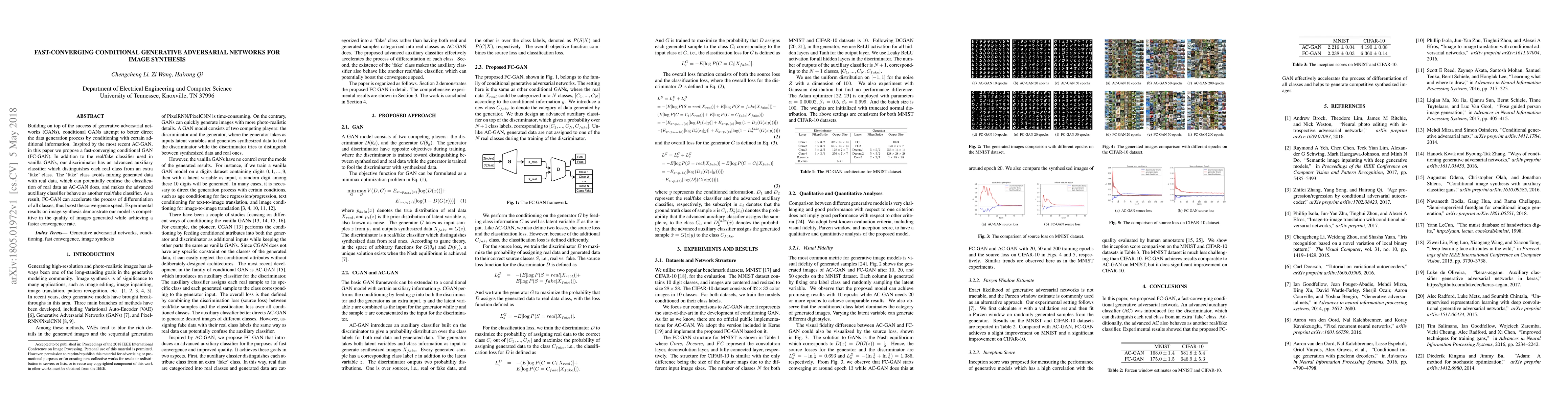 This paper proposes a fast-converging conditional GAN (FC-GAN) that enhances the discriminator with an auxiliary classifier to distinguish real classes from a separate 'fake' class, improving convergence speed. Experimental results show FC-GAN generates high-quality images faster than traditional methods.