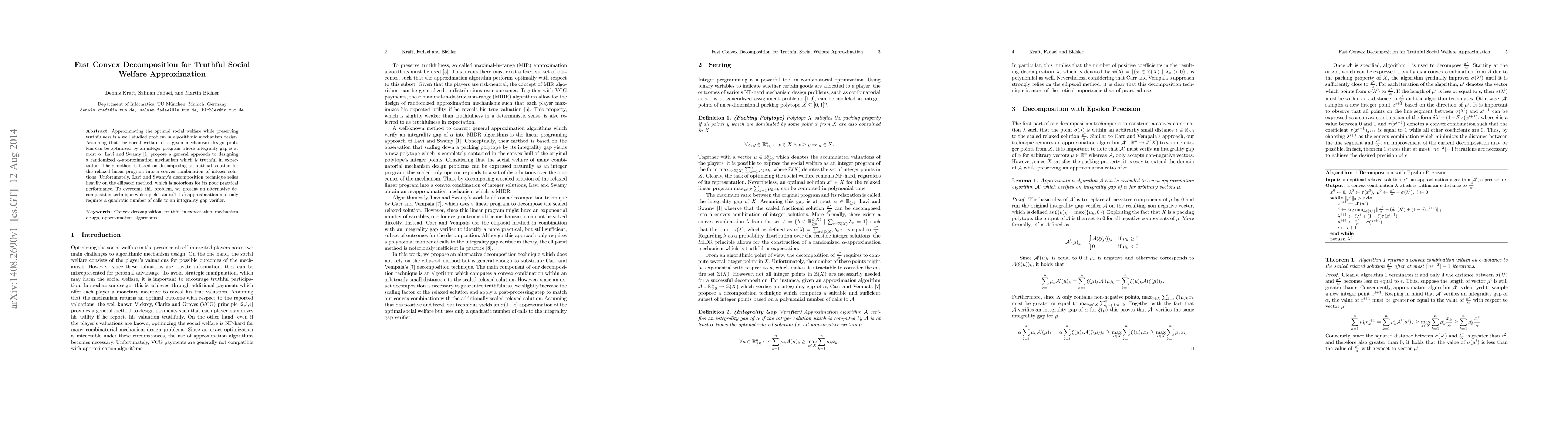 This paper proposes a new fast convex decomposition technique to efficiently approximate the optimal social welfare in truthful mechanism design, improving upon the ellipsoid method-based approach by requiring only a quadratic number of calls to an integrality gap verifier. The method achieves an $\alpha(1 + \epsilon)$ approximation while maintaining truthfulness.