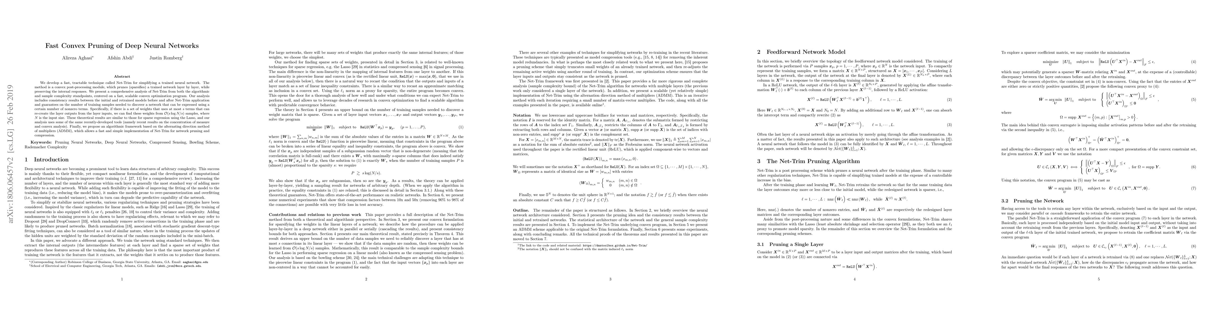 This paper introduces Net-Trim, a convex optimization-based method for simplifying trained neural networks by pruning layers. It guarantees that a network with at most s nonzero terms can be found using O(s log N/s) samples, similar to sparse regression with Lasso. The method is implemented using an ADMM-based framework for efficient pruning and compression.