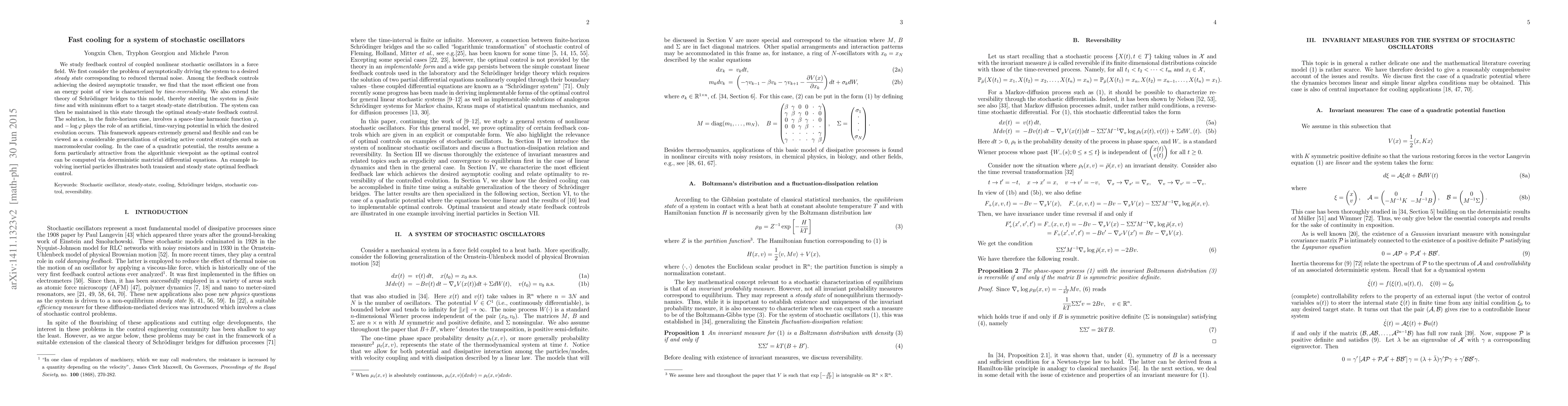 We study feedback control of coupled nonlinear stochastic oscillators in a force field. We first consider the problem of asymptotically driving the system to a desired {\em steady state} corresponding to reduced thermal noise. Among the feedback controls achieving the desired asymptotic transfer, we find that the most efficient one {from an energy point of view} is characterized by {\em time-reversibility}. We also extend the theory of Schr\"{o}dinger bridges to this model, thereby steering the system in {\em finite time} and with minimum effort to a target steady-state distribution. The system can then be maintained in this state through the optimal steady-state feedback control. The solution, in the finite-horizon case, involves a space-time harmonic function $\varphi$, and $-\log\varphi$ plays the role of an artificial, time-varying potential in which the desired evolution occurs. This framework appears extremely general and flexible and can be viewed as a considerable generalization of existing active control strategies such as macromolecular cooling. In the case of a quadratic potential, the results assume a form particularly attractive from the algorithmic viewpoint as the optimal control can be computed via deterministic matricial differential equations. An example involving inertial particles illustrates both transient and steady state optimal feedback control.