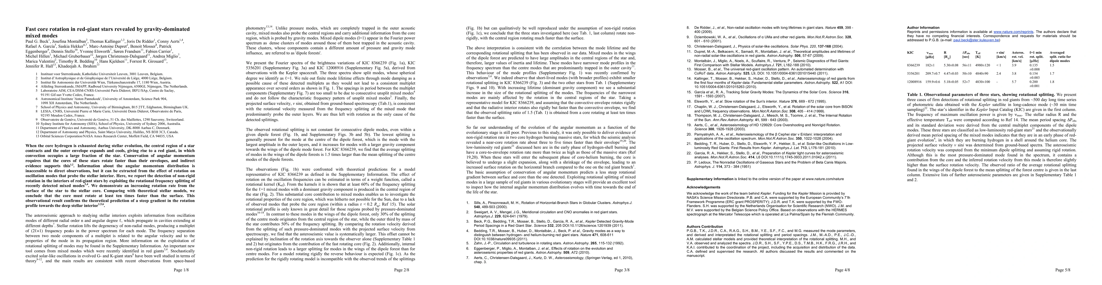 This paper reports the detection of fast core rotation in red-giant stars using gravity-dominated mixed modes, revealing a steep gradient in rotation from the surface to the core. The study confirms theoretical predictions of core rotation rates at least ten times faster than the surface, providing insights into angular momentum distribution in stellar interiors.