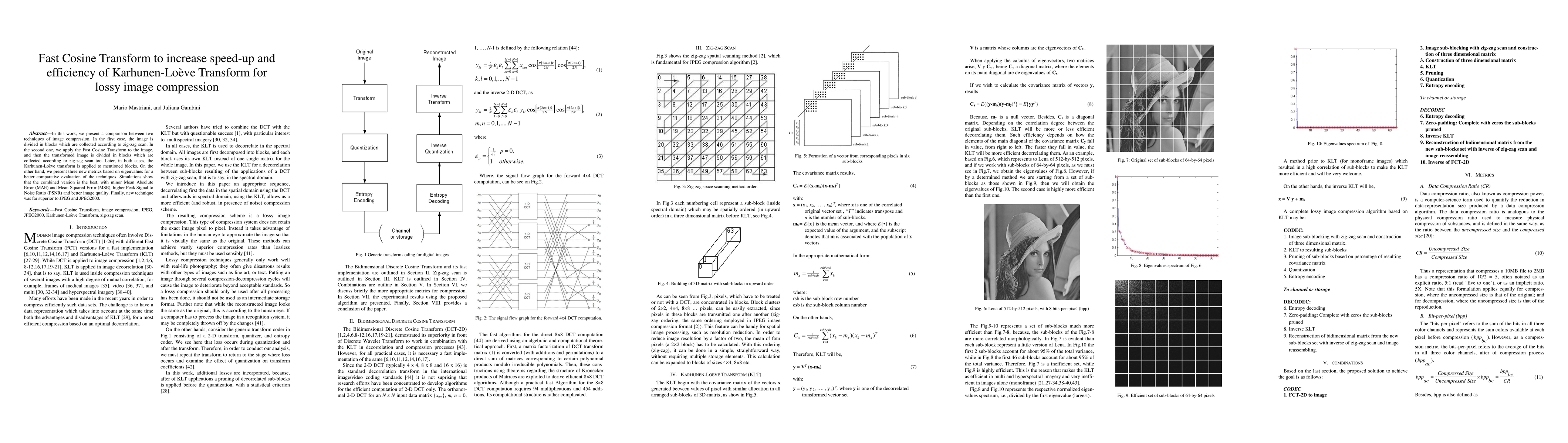 This paper compares two image compression techniques: one using the Karhunen-Loeve Transform (KLT) after a zig-zag scan, and another using the Fast Cosine Transform (FCT) followed by KLT. The FCT-KLT method shows superior performance with lower error metrics and higher image quality compared to traditional methods like JPEG and JPEG2000.