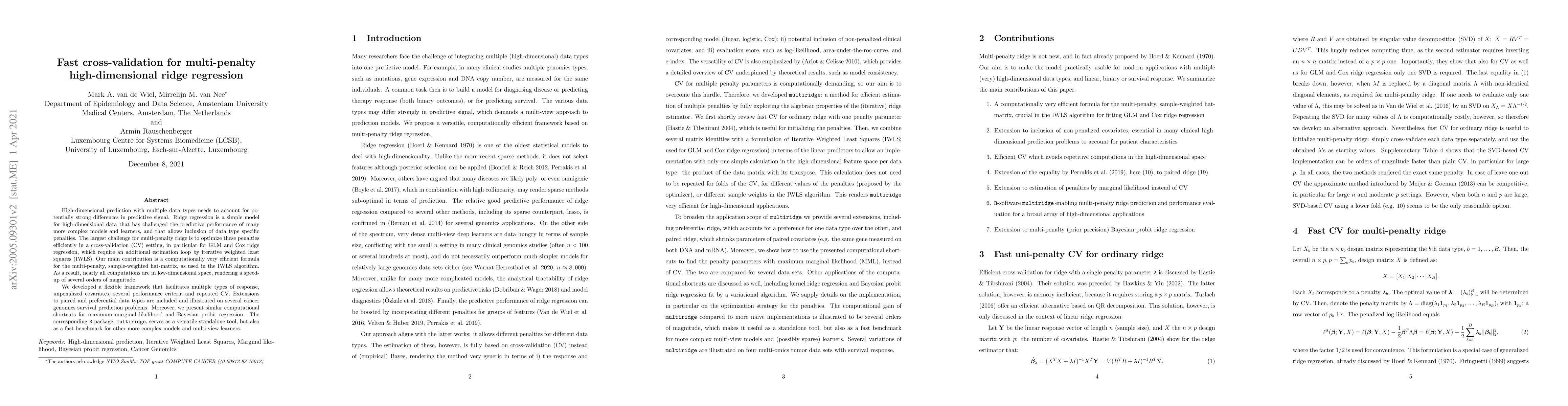 High-dimensional prediction with multiple data types needs to account for potentially strong differences in predictive signal. Ridge regression is a simple model for high-dimensional data that has challenged the predictive performance of many more complex models and learners, and that allows inclusion of data type specific penalties. The largest challenge for multi-penalty ridge is to optimize these penalties efficiently in a cross-validation (CV) setting, in particular for GLM and Cox ridge regression, which require an additional estimation loop by iterative weighted least squares (IWLS). Our main contribution is a computationally very efficient formula for the multi-penalty, sample-weighted hat-matrix, as used in the IWLS algorithm. As a result, nearly all computations are in low-dimensional space, rendering a speed-up of several orders of magnitude. We developed a flexible framework that facilitates multiple types of response, unpenalized covariates, several performance criteria and repeated CV. Extensions to paired and preferential data types are included and illustrated on several cancer genomics survival prediction problems. Moreover, we present similar computational shortcuts for maximum marginal likelihood and Bayesian probit regression. The corresponding R-package, multiridge, serves as a versatile standalone tool, but also as a fast benchmark for other more complex models and multi-view learners.