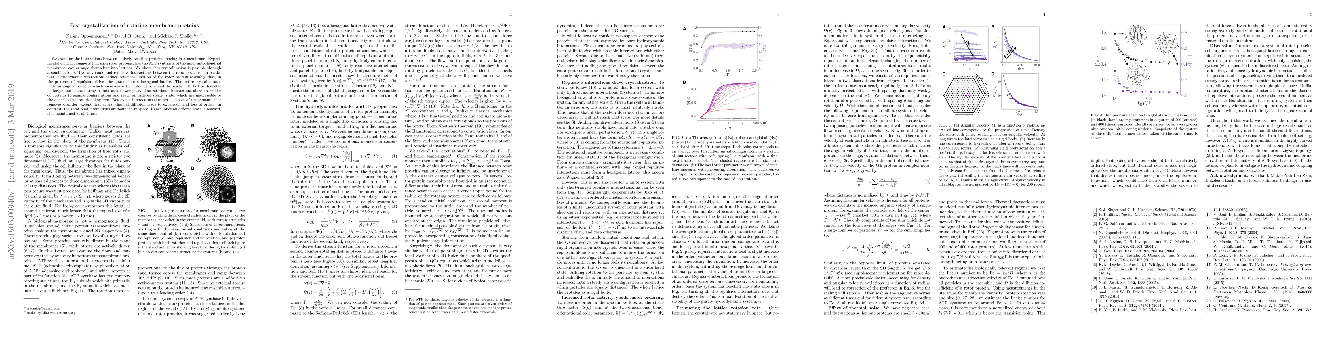 We examine the interactions between actively rotating proteins moving in a membrane. Experimental evidence suggests that such rotor proteins, like the ATP synthases of the inner mitochondrial membrane, can arrange themselves into lattices. We show that crystallization is possible through a combination of hydrodynamic and repulsive interactions between the rotor proteins. In particular, hydrodynamic interactions induce rotational motion of the rotor protein assembly that, in the presence of repulsion, drives the system into a hexagonal lattice. The entire crystal rotates with an angular velocity which increases with motor density and decreases with lattice diameter - larger and sparser arrays rotate at a slower pace. The rotational interactions allow ensembles of proteins to sample configurations and reach an ordered steady state, which are inaccessible to the quenched nonrotational system. Rotational interactions thus act as a sort of temperature that removes disorder, except that actual thermal diffusion leads to expansion and loss of order. In contrast, the rotational interactions are bounded in space. Hence, once an ordered state is reached, it is maintained at all times.