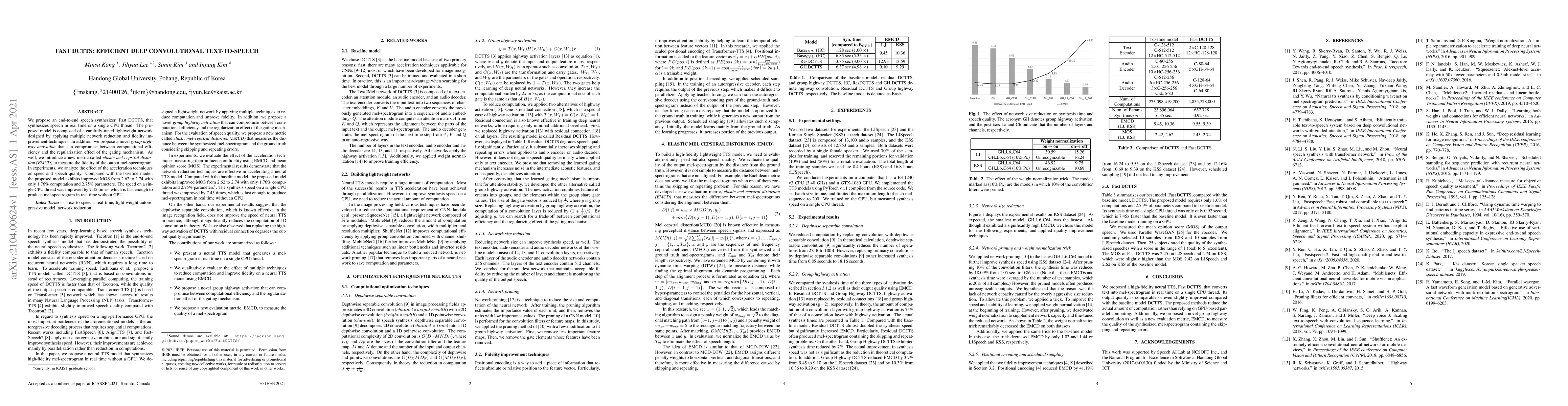 Fast DCTTS is an efficient real-time text-to-speech model that synthesizes speech on a single CPU thread, achieving a 7.45x speedup through network reduction and a novel group highway activation. The model improves speech quality with an EMCD metric, showing a MOS score increase from 2.62 to 2.74.