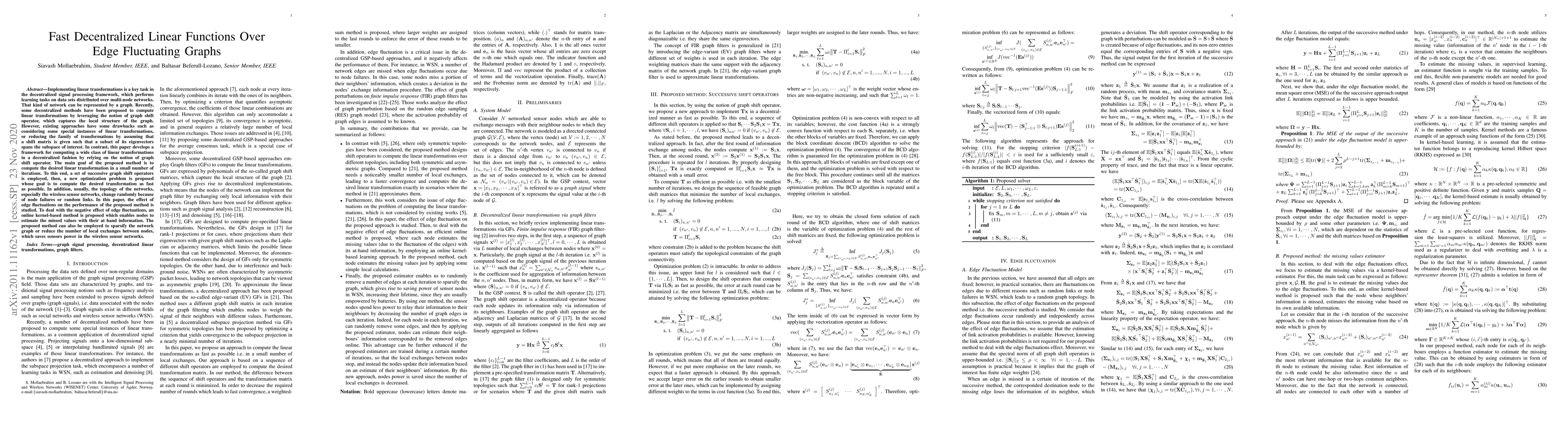 This paper presents a decentralized method for computing a wide range of linear transformations using graph shift operators. It addresses the limitations of existing approaches and focuses on fast computation in iterations. The method also considers edge fluctuations in networks, proposing an online kernel-based solution for estimating missing values. This approach can sparsify network graphs and reduce power consumption in wireless sensor networks.