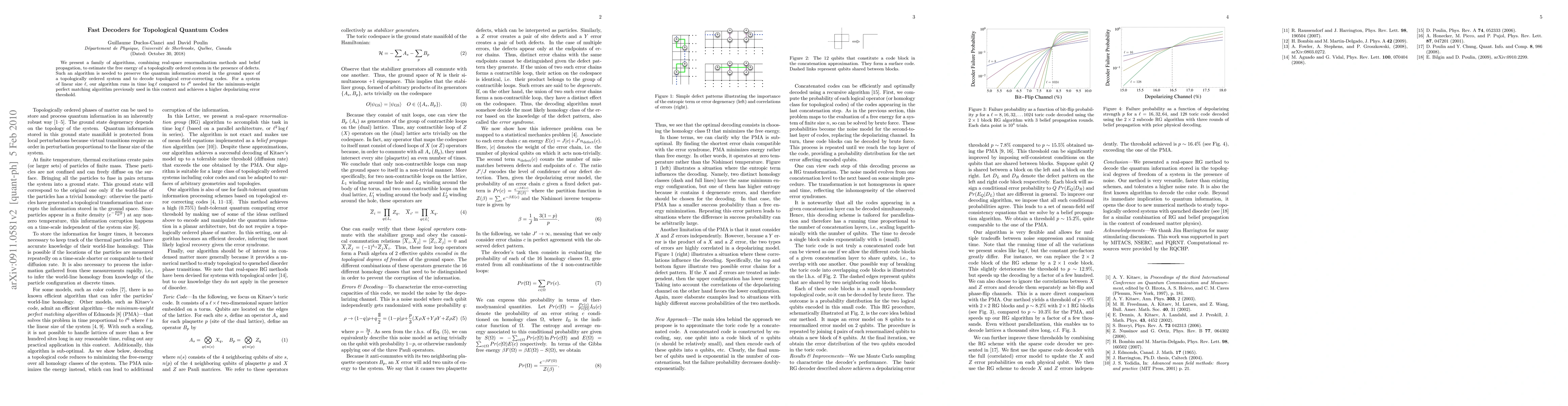 We present a family of algorithms, combining real-space renormalization methods and belief propagation, to estimate the free energy of a topologically ordered system in the presence of defects. Such an algorithm is needed to preserve the quantum information stored in the ground space of a topologically ordered system and to decode topological error-correcting codes. For a system of linear size L, our algorithm runs in time log L compared to L^6 needed for the minimum-weight perfect matching algorithm previously used in this context and achieves a higher depolarizing error threshold.
