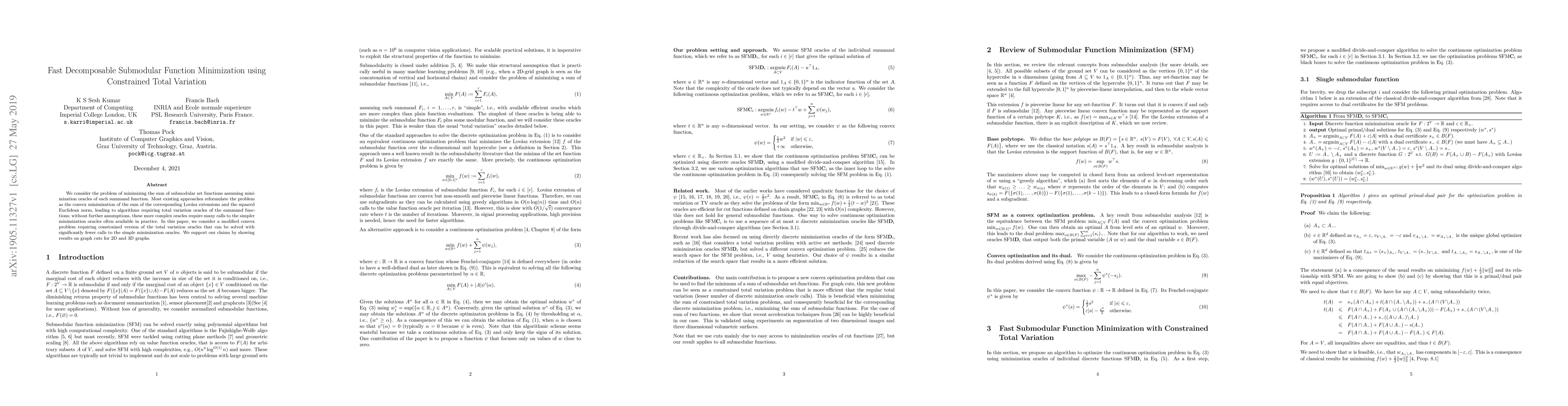 This paper proposes a method to minimize decomposable submodular functions using constrained total variation, reducing the number of calls to simple minimization oracles compared to existing approaches. The method reformulates the problem into a more efficient convex optimization problem, demonstrated through applications to graph cuts in 2D and 3D graphs.