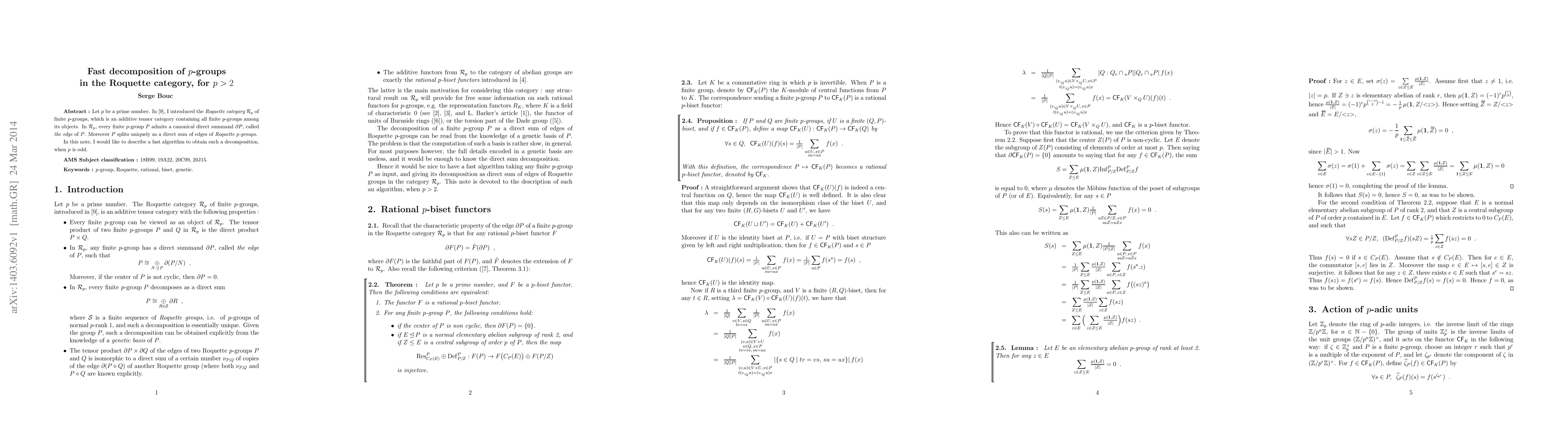 Let p be a prime number. In [9], I introduced the Roquette category R_p of finite p-groups, which is an additive tensor category containing all finite p-groups among its objects. In R_p, every finite p-group P admits a canonical direct summand dP, called the edge of P. Moreover P splits uniquely as a direct sum of edges of Roquette p-groups. In this note, I would like to describe a fast algorithm to obtain such a decomposition, when p is odd. ref: [9] The Roquette category of finite p-groups, J.E.M.S (to appear)