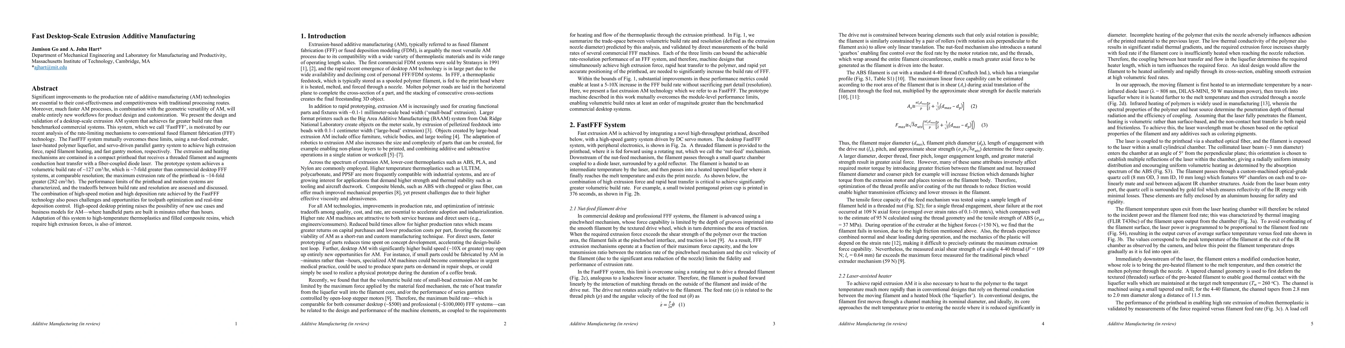 This paper introduces FastFFF, a desktop-scale extrusion additive manufacturing system that significantly boosts production rates by 7-fold compared to commercial desktop FFF systems, utilizing advanced components like a nut-feed extruder and laser-heated polymer liquefier. The system's high-speed capabilities open new possibilities for rapid prototyping and customized manufacturing workflows.