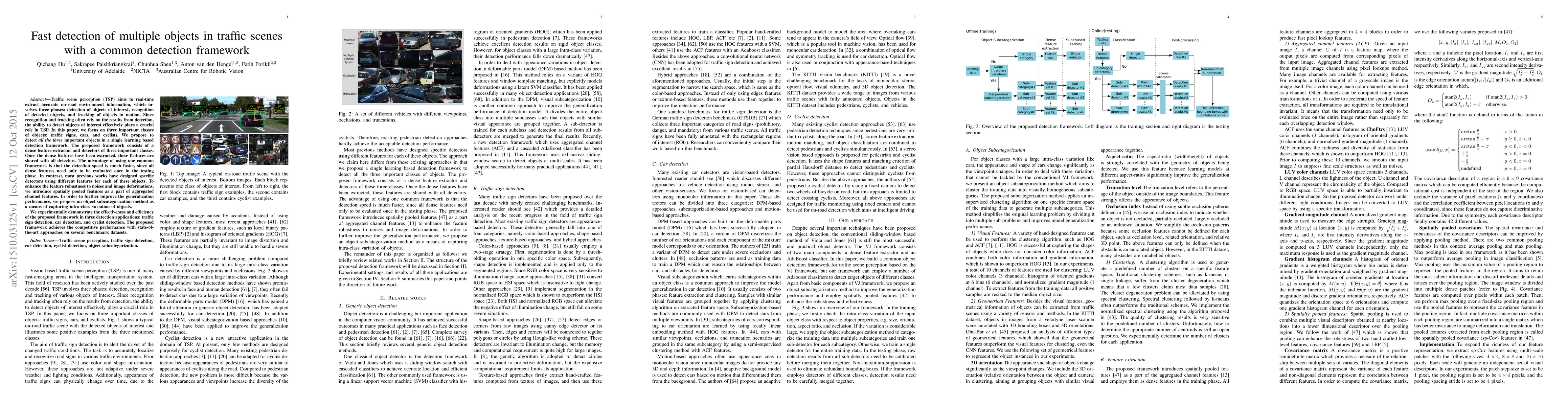 Traffic scene perception (TSP) aims to real-time extract accurate on-road environment information, which in- volves three phases: detection of objects of interest, recognition of detected objects, and tracking of objects in motion. Since recognition and tracking often rely on the results from detection, the ability to detect objects of interest effectively plays a crucial role in TSP. In this paper, we focus on three important classes of objects: traffic signs, cars, and cyclists. We propose to detect all the three important objects in a single learning based detection framework. The proposed framework consists of a dense feature extractor and detectors of three important classes. Once the dense features have been extracted, these features are shared with all detectors. The advantage of using one common framework is that the detection speed is much faster, since all dense features need only to be evaluated once in the testing phase. In contrast, most previous works have designed specific detectors using different features for each of these objects. To enhance the feature robustness to noises and image deformations, we introduce spatially pooled features as a part of aggregated channel features. In order to further improve the generalization performance, we propose an object subcategorization method as a means of capturing intra-class variation of objects. We experimentally demonstrate the effectiveness and efficiency of the proposed framework in three detection applications: traffic sign detection, car detection, and cyclist detection. The proposed framework achieves the competitive performance with state-of- the-art approaches on several benchmark datasets.