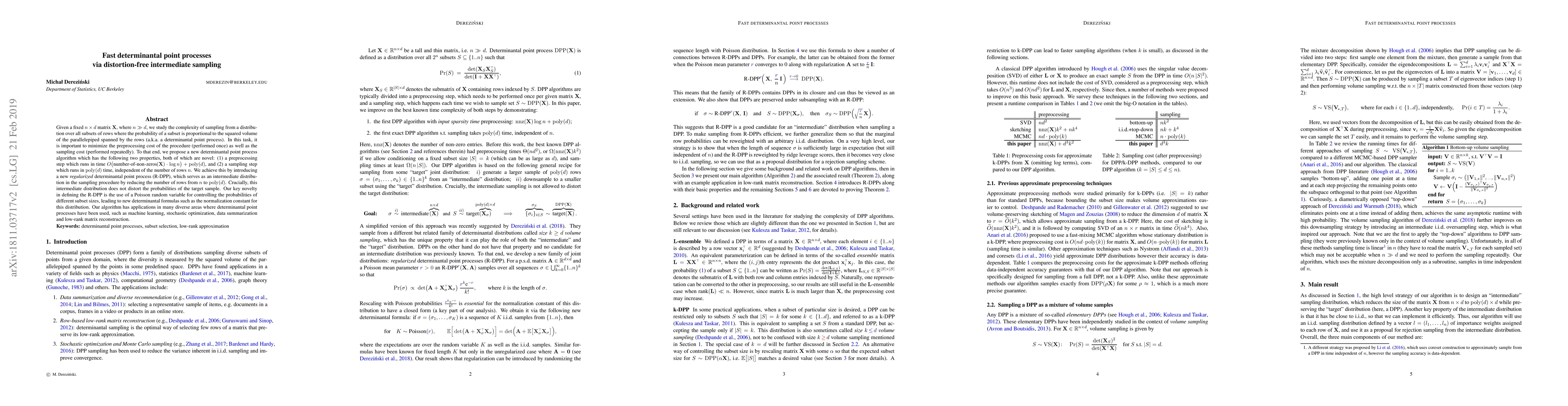 This paper proposes a new algorithm for fast sampling from determinantal point processes, achieving preprocessing and sampling times of $O(\text{number-of-non-zeros}(\mathbf{X})\cdot\log n)+\text{poly}(d)$ and $\text{poly}(d)$, respectively. It introduces a regularized determinantal point process (R-DPP) that maintains the original probabilities without distortion, using a Poisson random variable to control subset sizes.