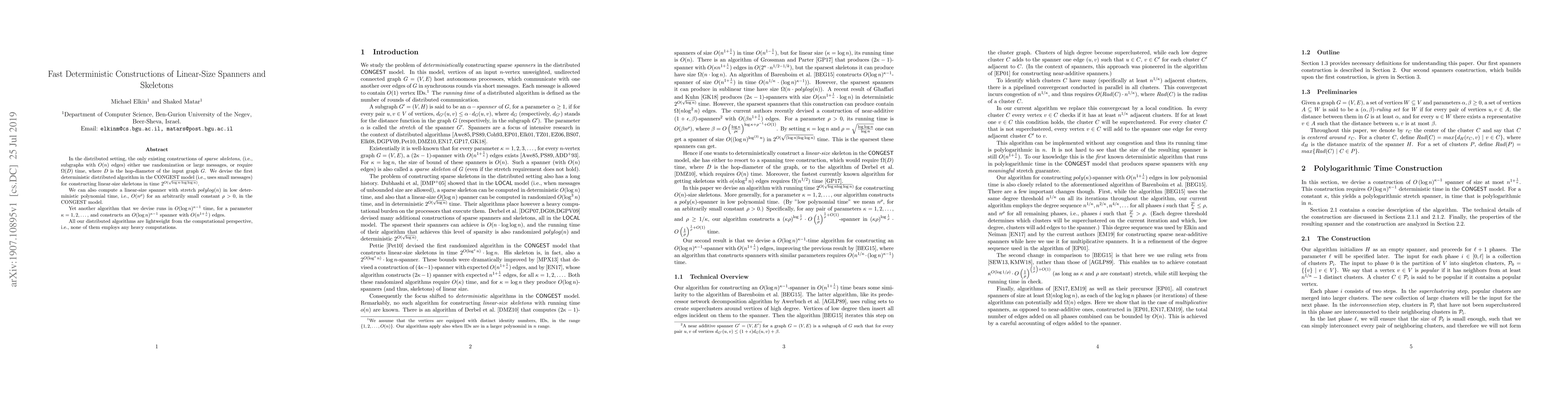 This paper presents deterministic distributed algorithms for constructing linear-size skeletons and spanners in the CONGEST model, achieving efficient time complexities of $2^{O( ext{log n})}$ and $O({ ext{log n}})^{ ho-1}$, respectively.
