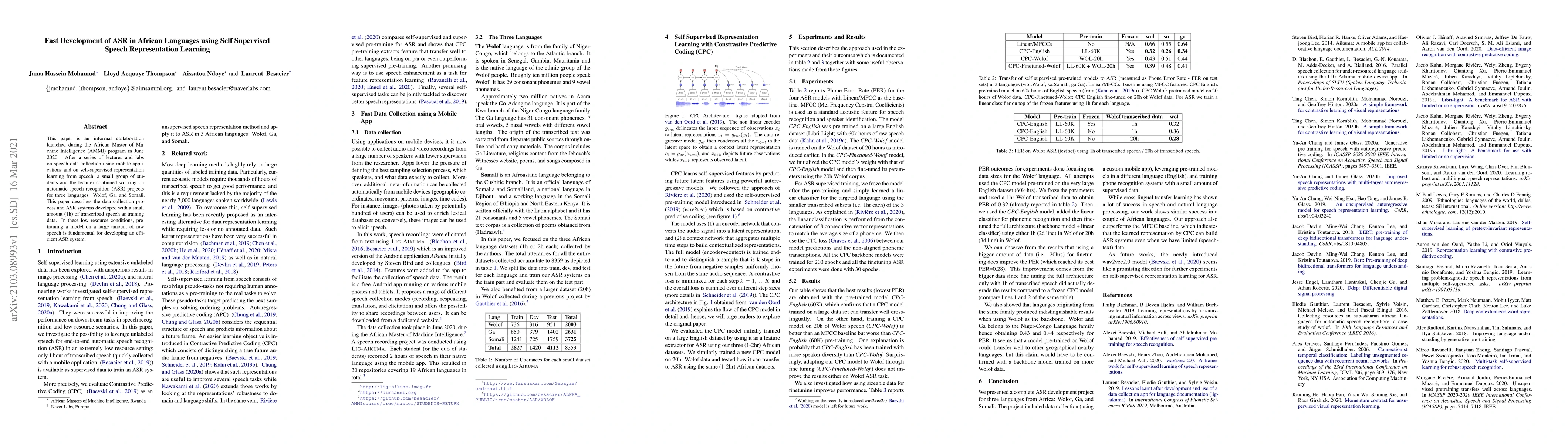 This paper describes the results of an informal collaboration launched during the African Master of Machine Intelligence (AMMI) in June 2020. After a series of lectures and labs on speech data collection using mobile applications and on self-supervised representation learning from speech, a small group of students and the lecturer continued working on automatic speech recognition (ASR) project for three languages: Wolof, Ga, and Somali. This paper describes how data was collected and ASR systems developed with a small amount (1h) of transcribed speech as training data. In these low resource conditions, pre-training a model on large amounts of raw speech was fundamental for the efficiency of ASR systems developed.