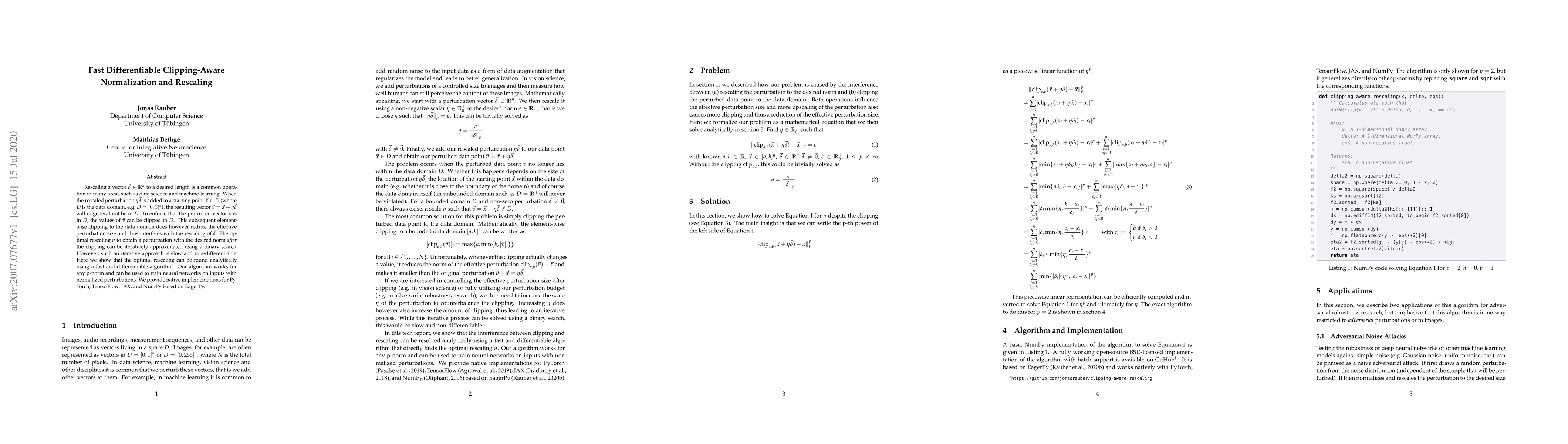This paper proposes a fast, differentiable algorithm for rescaling vectors to a desired length while ensuring the clipped result remains within a specified domain, addressing the issue of reduced perturbation size due to clipping. The method is applicable to any p-norm and enables training neural networks with normalized perturbations efficiently.