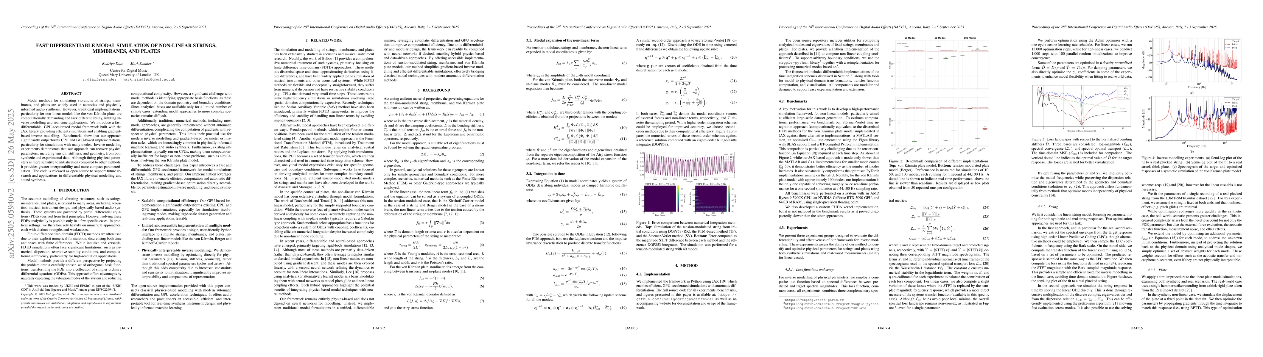 The research introduces a fast, differentiable, GPU-accelerated modal framework built with the JAX library for simulating vibrations of non-linear strings, membranes, and plates, enabling efficient simulations and gradient-based inverse modelling.