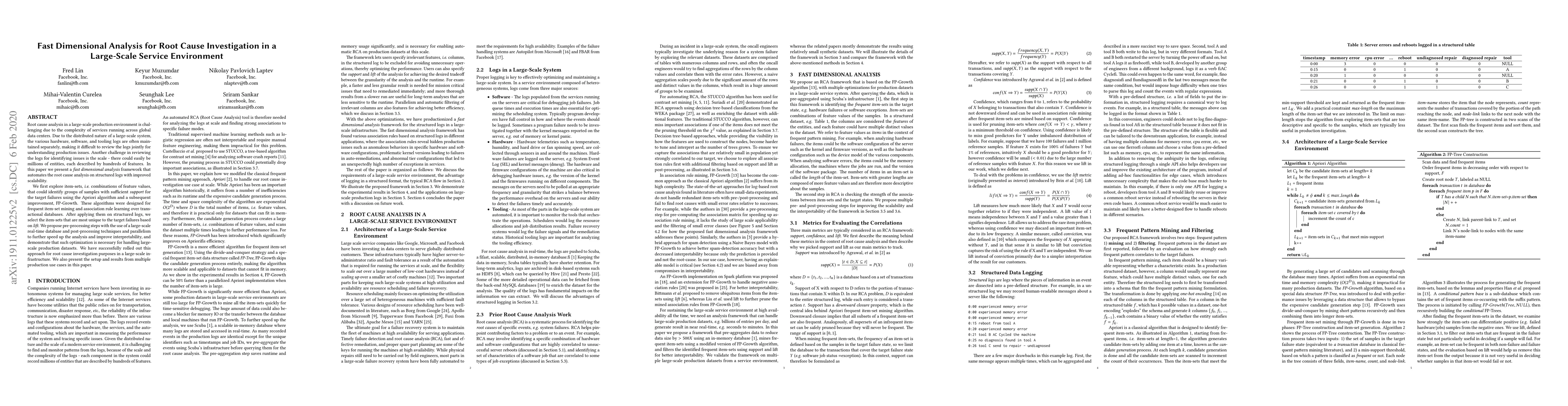 This paper introduces a fast dimensional analysis framework to automate root cause investigation in large-scale production environments by leveraging item-set mining algorithms like Apriori and FP-Growth to identify unique feature combinations associated with target failures. The approach incorporates pre-processing and post-processing techniques to enhance scalability and interpretability, demonstrating successful application in multiple production scenarios.