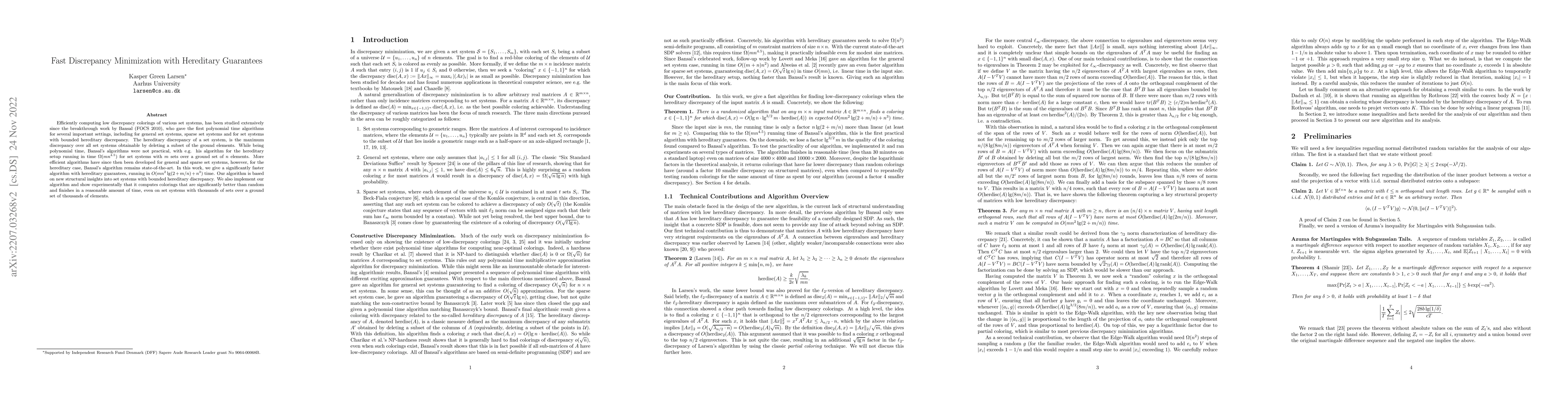 Efficiently computing low discrepancy colorings of various set systems, has been studied extensively since the breakthrough work by Bansal (FOCS 2010), who gave the first polynomial time algorithms for several important settings, including for general set systems, sparse set systems and for set systems with bounded hereditary discrepancy. The hereditary discrepancy of a set system, is the maximum discrepancy over all set systems obtainable by deleting a subset of the ground elements. While being polynomial time, Bansal's algorithms were not practical, with e.g. his algorithm for the hereditary setup running in time $\Omega(m n^{4.5})$ for set systems with $m$ sets over a ground set of $n$ elements. More efficient algorithms have since then been developed for general and sparse set systems, however, for the hereditary case, Bansal's algorithm remains state-of-the-art. In this work, we give a significantly faster algorithm with hereditary guarantees, running in $O(mn^2\lg(2 + m/n) + n^3)$ time. Our algorithm is based on new structural insights into set systems with bounded hereditary discrepancy. We also implement our algorithm and show experimentally that it computes colorings that are significantly better than random and finishes in a reasonable amount of time, even on set systems with thousands of sets over a ground set of thousands of elements.