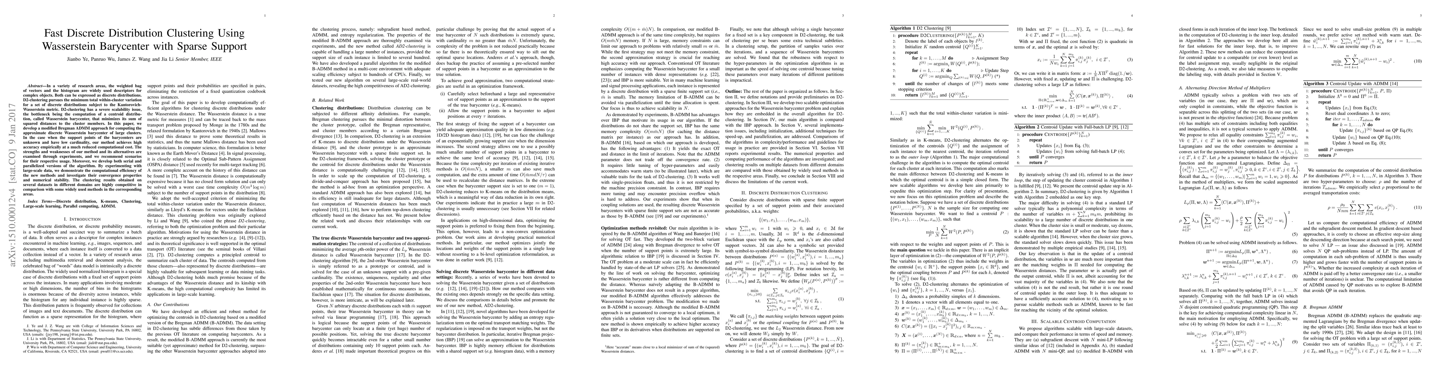 In a variety of research areas, the weighted bag of vectors and the histogram are widely used descriptors for complex objects. Both can be expressed as discrete distributions. D2-clustering pursues the minimum total within-cluster variation for a set of discrete distributions subject to the Kantorovich-Wasserstein metric. D2-clustering has a severe scalability issue, the bottleneck being the computation of a centroid distribution, called Wasserstein barycenter, that minimizes its sum of squared distances to the cluster members. In this paper, we develop a modified Bregman ADMM approach for computing the approximate discrete Wasserstein barycenter of large clusters. In the case when the support points of the barycenters are unknown and have low cardinality, our method achieves high accuracy empirically at a much reduced computational cost. The strengths and weaknesses of our method and its alternatives are examined through experiments, and we recommend scenarios for their respective usage. Moreover, we develop both serial and parallelized versions of the algorithm. By experimenting with large-scale data, we demonstrate the computational efficiency of the new methods and investigate their convergence properties and numerical stability. The clustering results obtained on several datasets in different domains are highly competitive in comparison with some widely used methods in the corresponding areas.