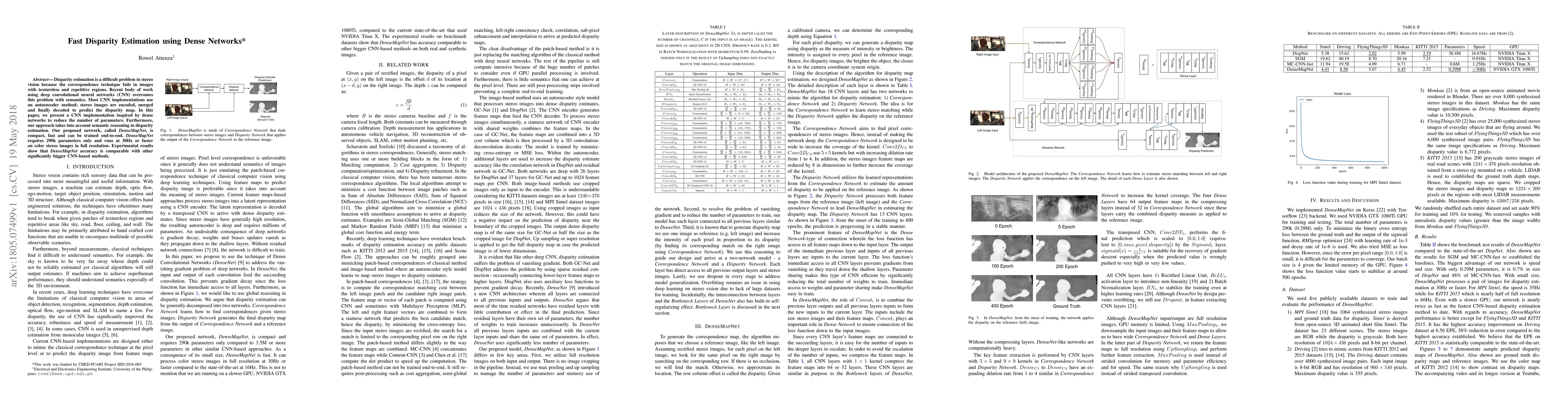 This paper introduces DenseMapNet, a compact convolutional neural network inspired by dense networks for fast disparity estimation in stereo vision. Despite its reduced parameter count, DenseMapNet achieves comparable accuracy to larger CNNs and operates at 30Hz or faster on full resolution color stereo images.