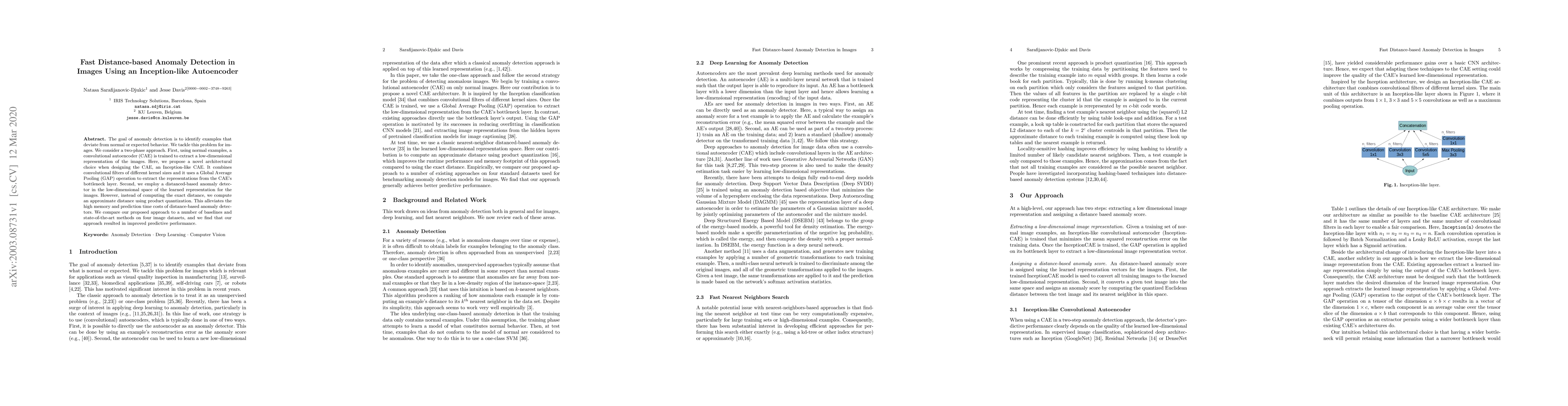 The goal of anomaly detection is to identify examples that deviate from normal or expected behavior. We tackle this problem for images. We consider a two-phase approach. First, using normal examples, a convolutional autoencoder (CAE) is trained to extract a low-dimensional representation of the images. Here, we propose a novel architectural choice when designing the CAE, an Inception-like CAE. It combines convolutional filters of different kernel sizes and it uses a Global Average Pooling (GAP) operation to extract the representations from the CAE's bottleneck layer. Second, we employ a distanced-based anomaly detector in the low-dimensional space of the learned representation for the images. However, instead of computing the exact distance, we compute an approximate distance using product quantization. This alleviates the high memory and prediction time costs of distance-based anomaly detectors. We compare our proposed approach to a number of baselines and state-of-the-art methods on four image datasets, and we find that our approach resulted in improved predictive performance.
